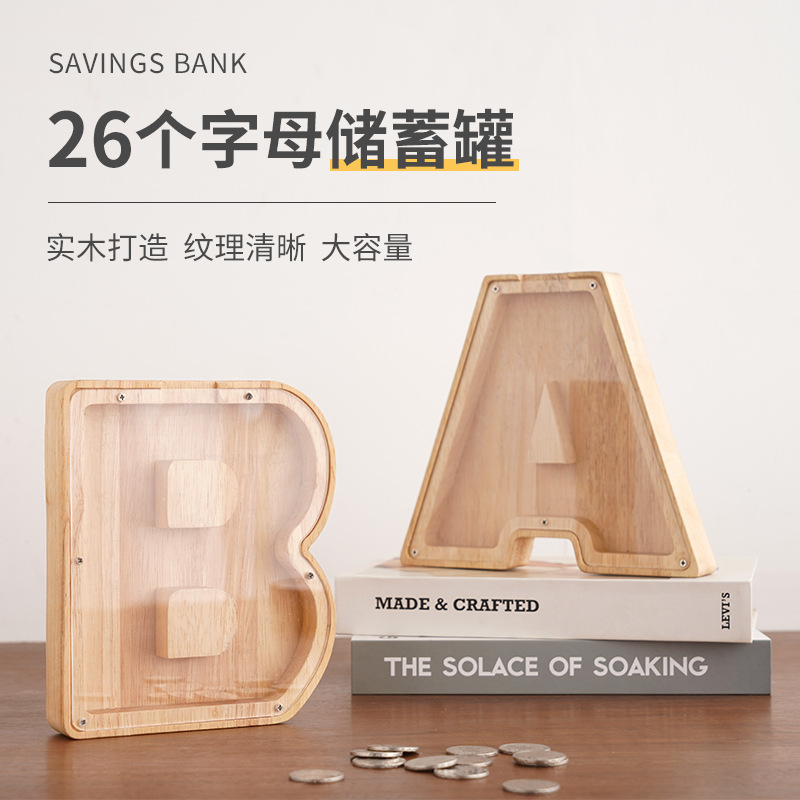 木製アルファベット貯金箱透明ガラス貯金箱26個英語ins風実木貯金箱