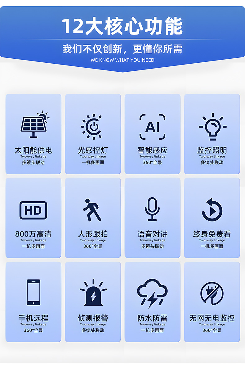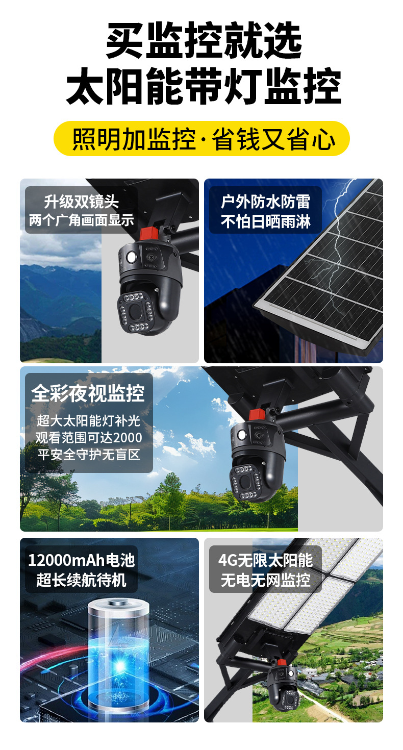 1200万像素WiFi太阳能安防摄像头360度云台三镜头双光低功耗闭