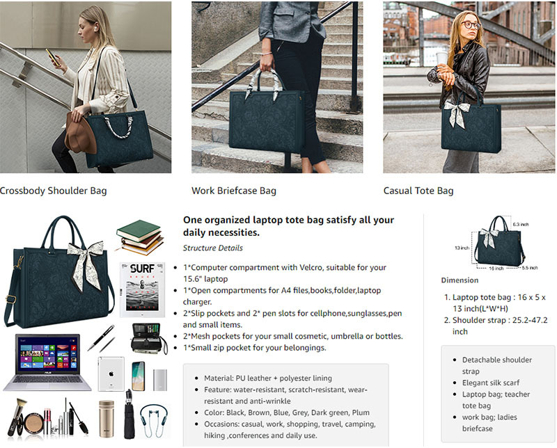 IGOLUMON 新しいアマゾン防水 PU ハンドバッグ ショルダー クロスボディバッグ 15.6inch ラップトップ バッグ