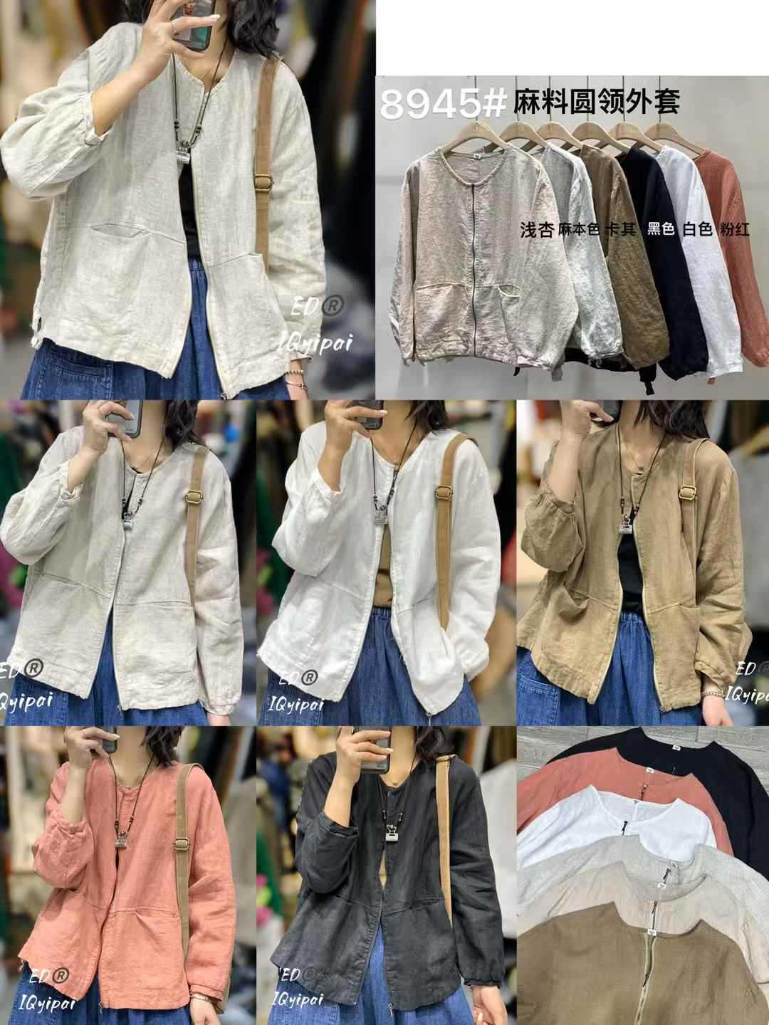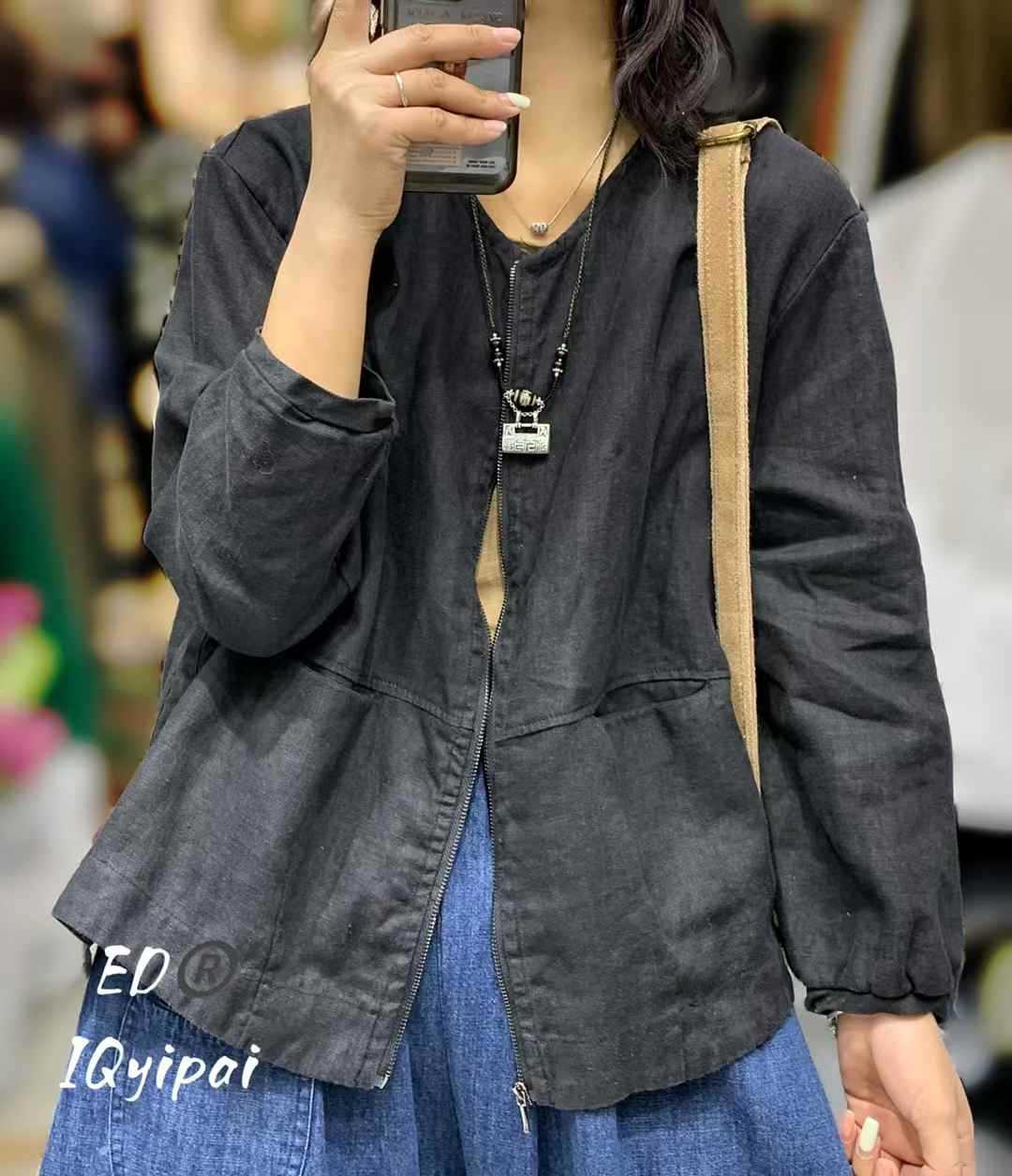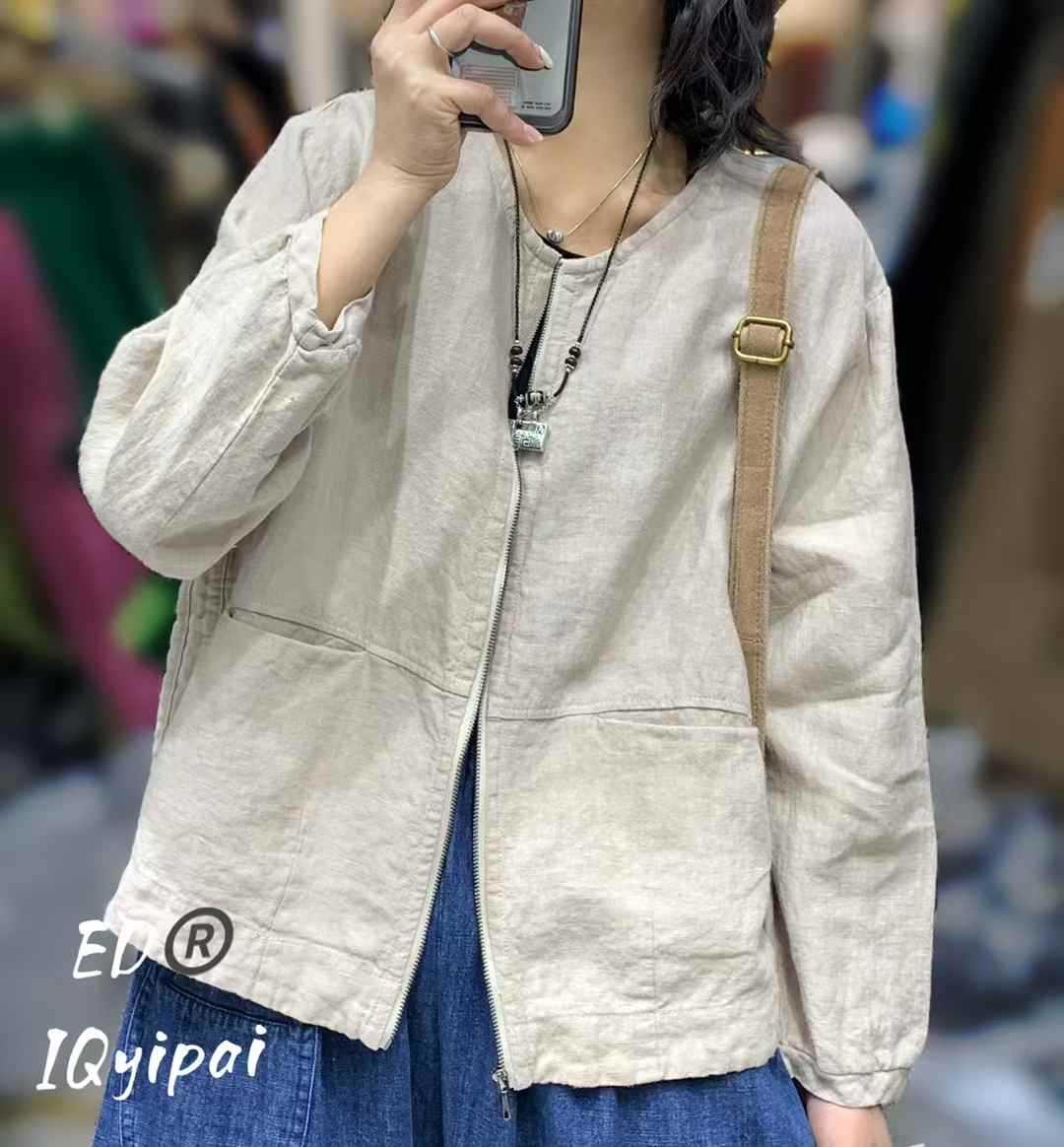 Ed8945麻の丸首のゆったりしたレトロなファスナーの長袖のコート2025の新型の文芸の気質のカーディガンの外で女性を掛けます。