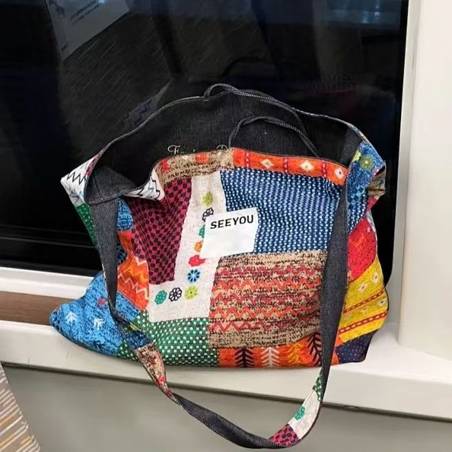二枚のパンのボヘミアンデニムのキャンバスバッグには、通勤用のトートバッグの両面にレトロな衝突色の斜め掛けバッグがあります。