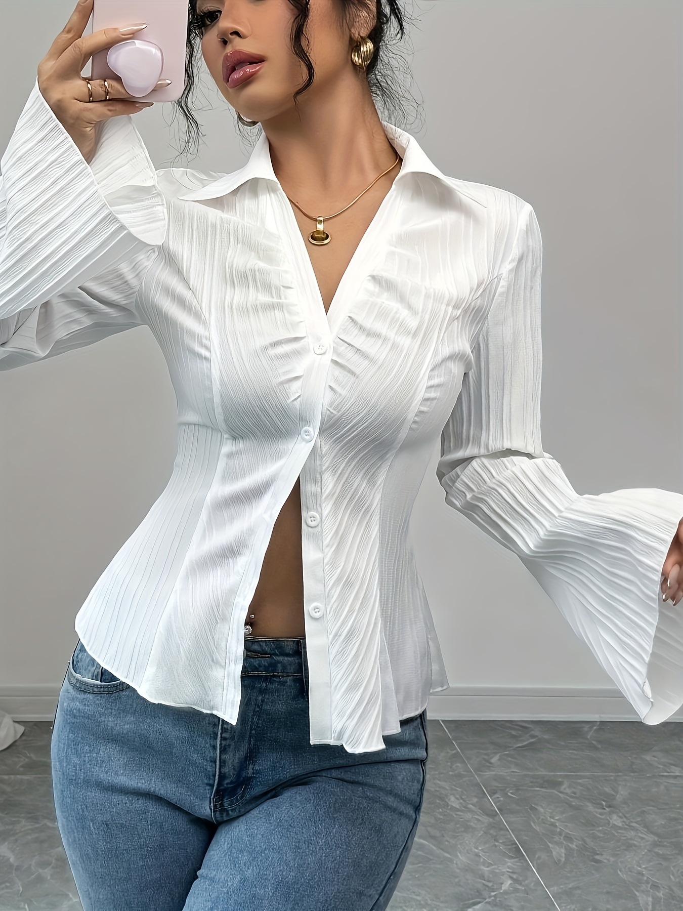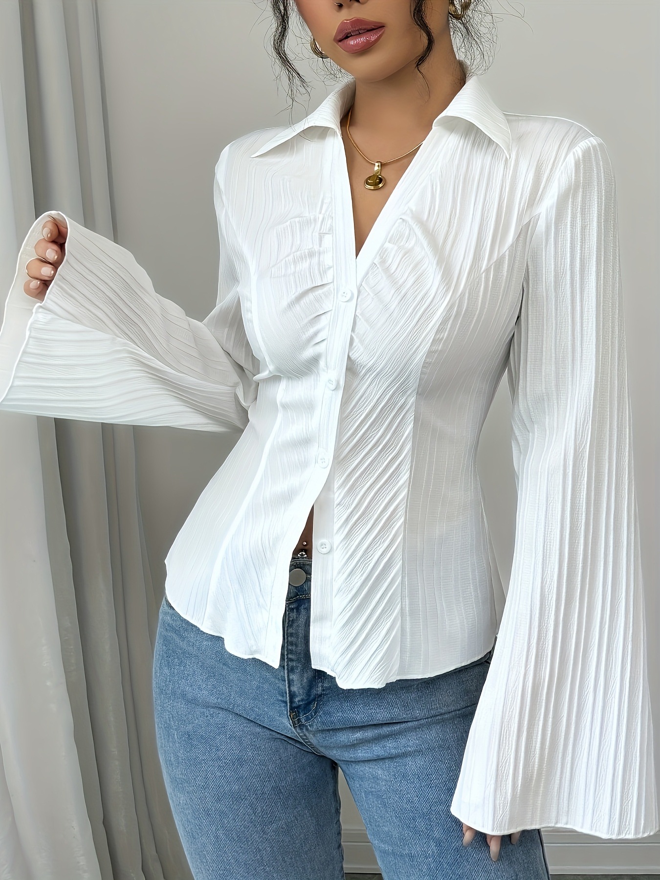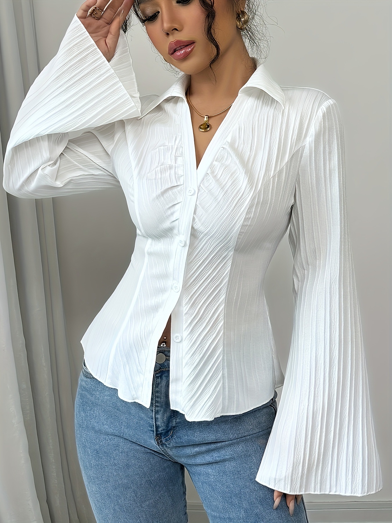 欧美跨境2025秋季V字翻领收腰长袖衬衫 纽扣别致独特内搭修身上衣