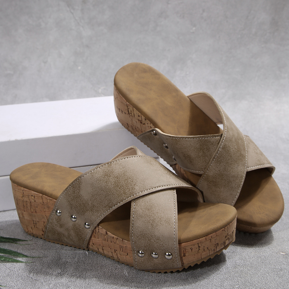 外国貿易大きいサイズの婦人靴 2025 春夏新作クロスボーダーウェッジヒール厚底魚口スリッパフラワー装飾付き