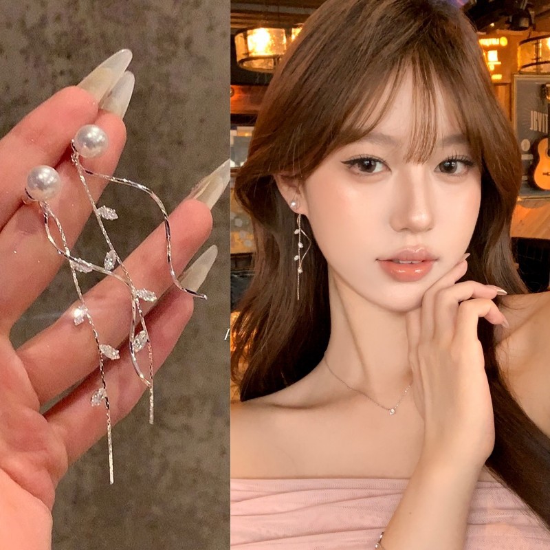 韩系闪锆树叶珍珠流苏耳环女轻奢高级感气质耳钉耳饰网红款ins风