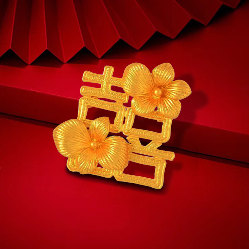 国潮哑金喜字胸针轻奢高级感花朵新中式文字胸花新郎新娘别针配饰