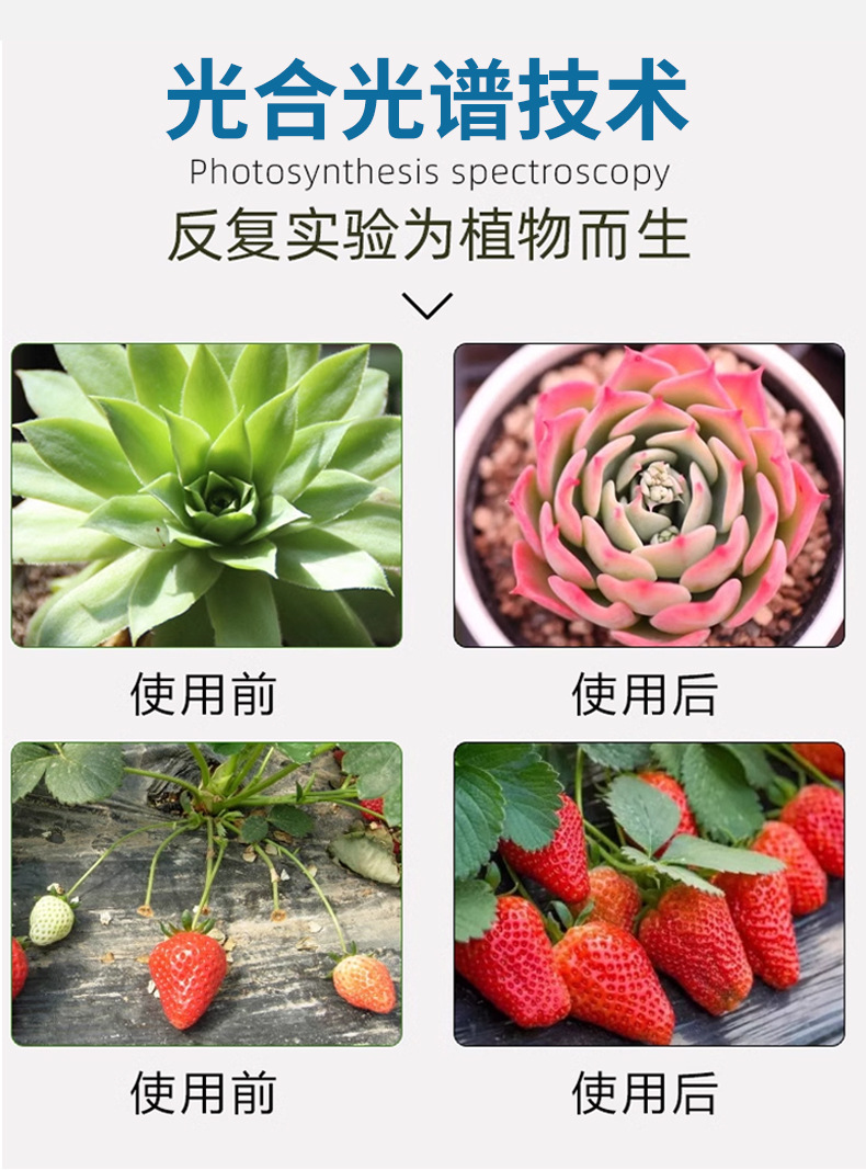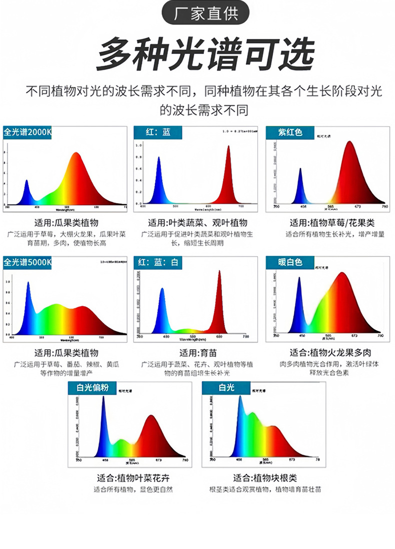 太陽光を完全に再現(多肉植物の着色に特化),フルスペクトルの白色光 (緑色の植物のみ)
