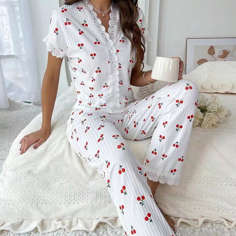ヨーロッパとアメリカンスタイルの女性のパジャマ秋と冬のセクシーな V ネックレースチェリープリント Tシャツスリムパンツホームウェアカーディガン
