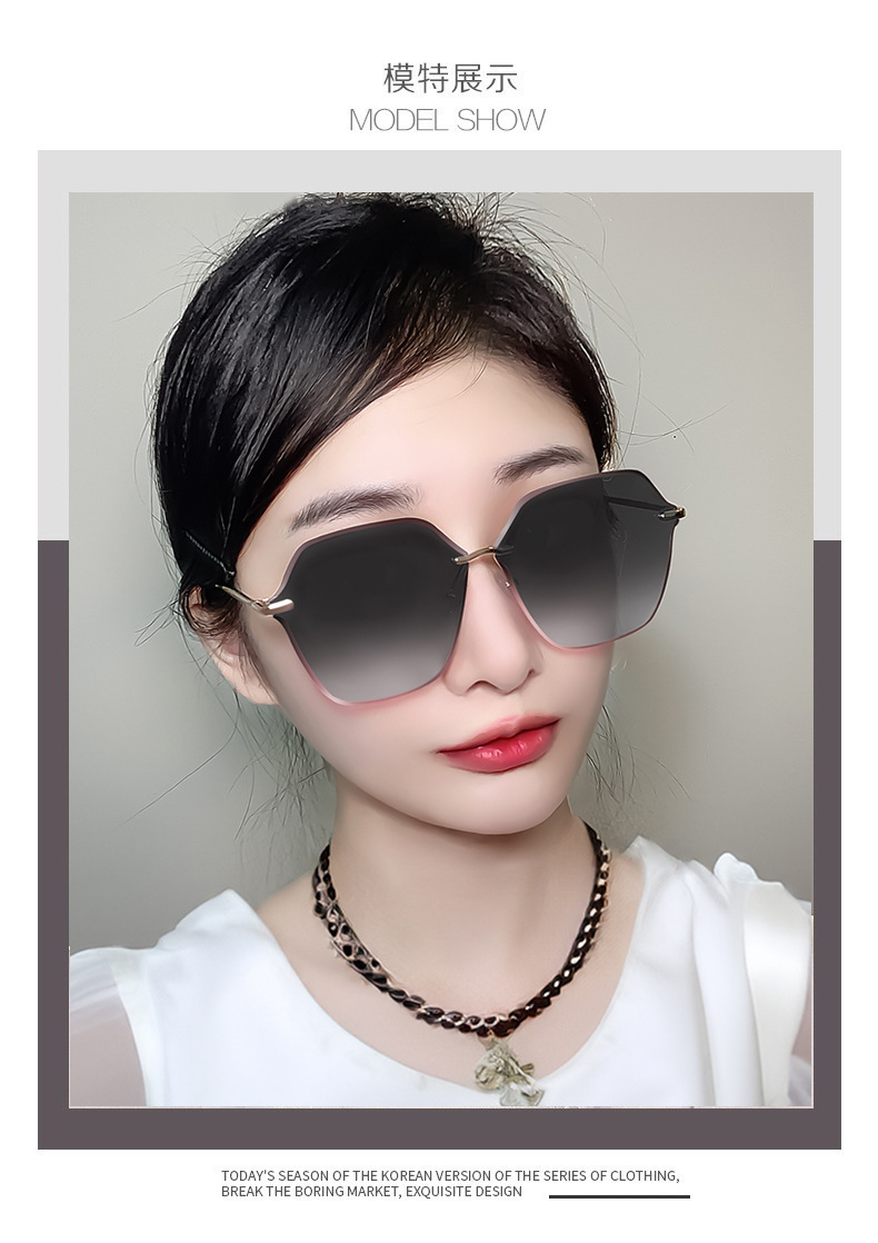 顔の大きな女性向けの新しい抗UVグラデーションサングラス、日焼け止め、フレームレスカットエッジサングラス、高級感、小顔