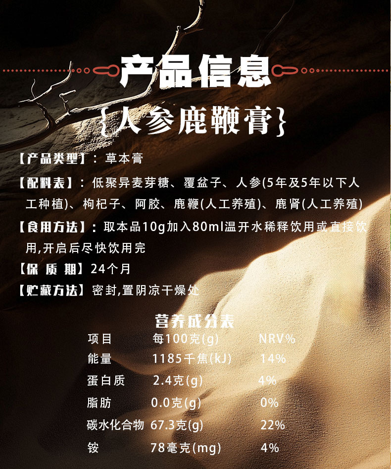 主な原材料 高麗人参、クコ、ロバ皮ゼラチン、鹿の鞭、鹿の腎臓