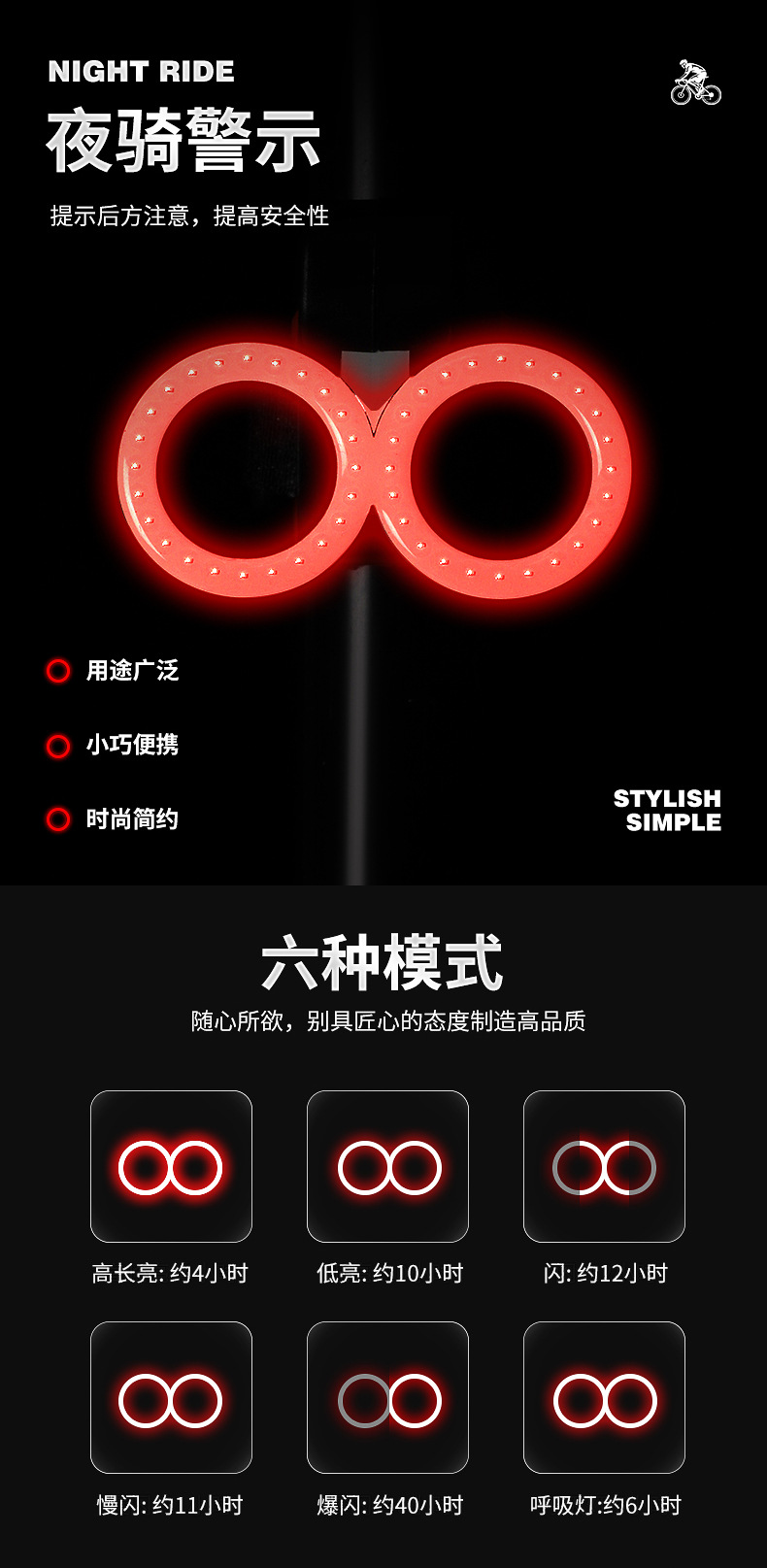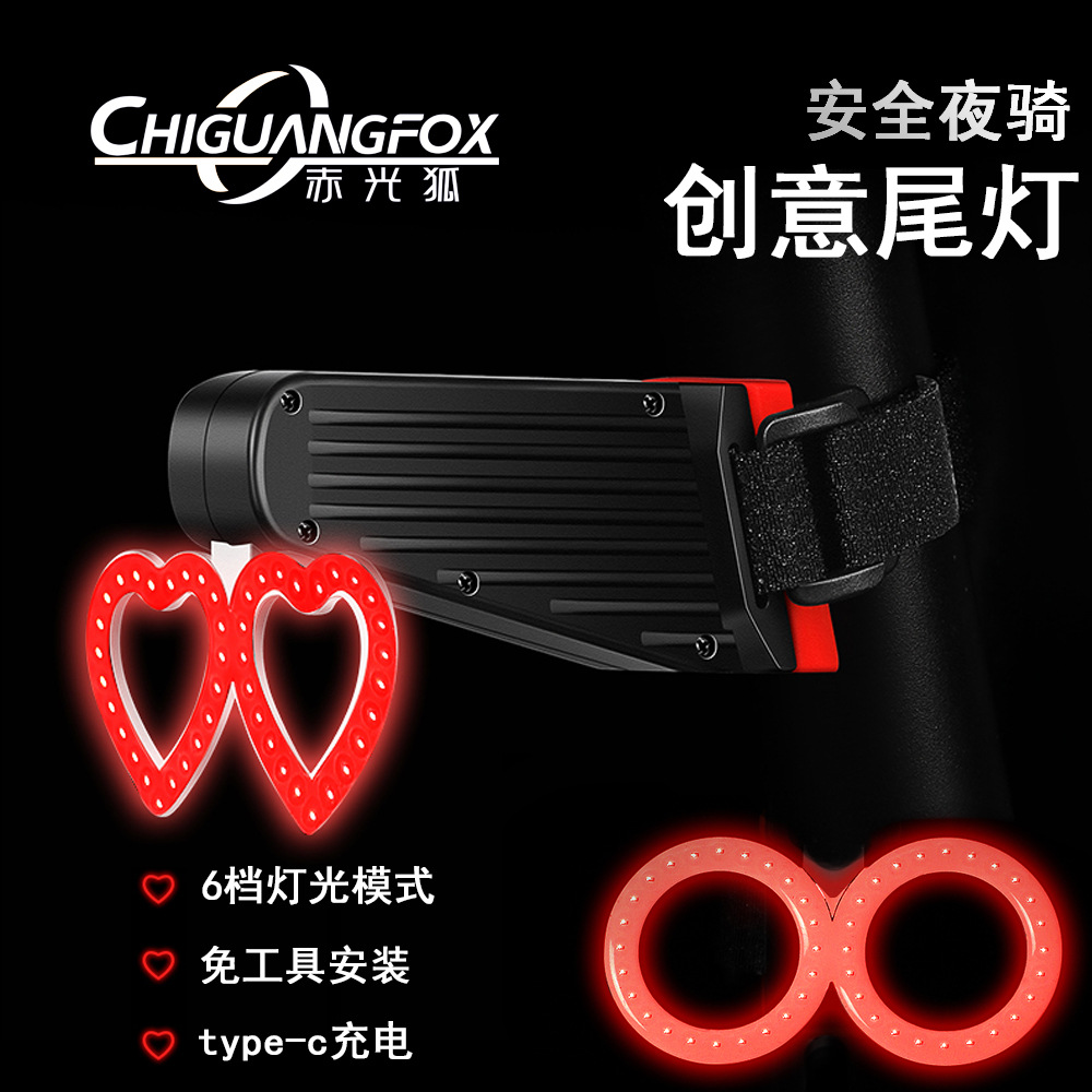 セルフバイクリングダブルラブクリエイティブテールライト、充電式、マルチモード、長いバッテリー寿命、夜間走行、取り付けが簡単、COBハイライト警告灯