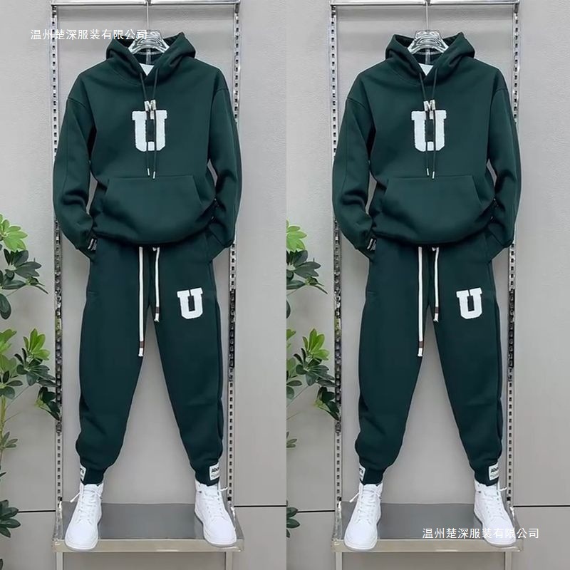 2025新款春秋运动套装男潮流宽松加绒保暖连帽卫衣束脚卫裤两件套