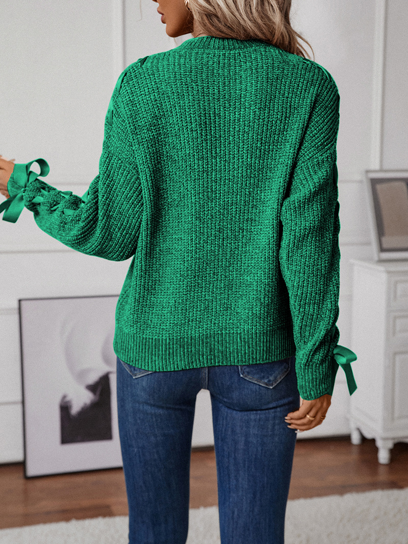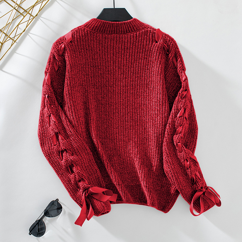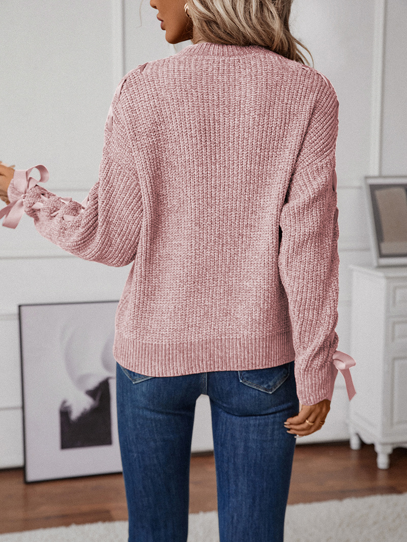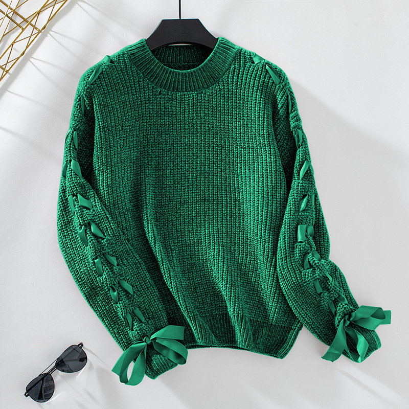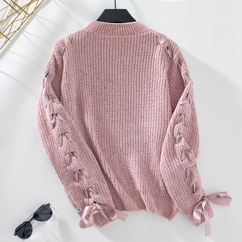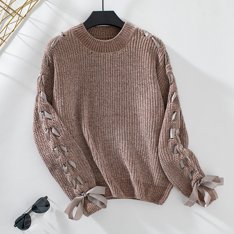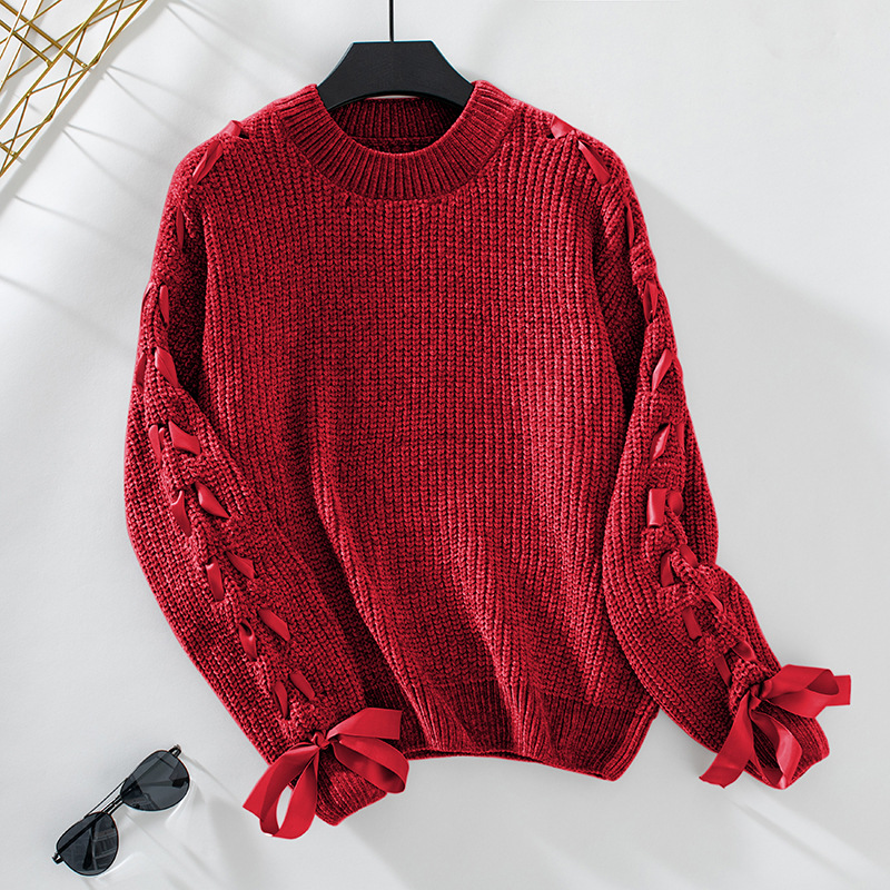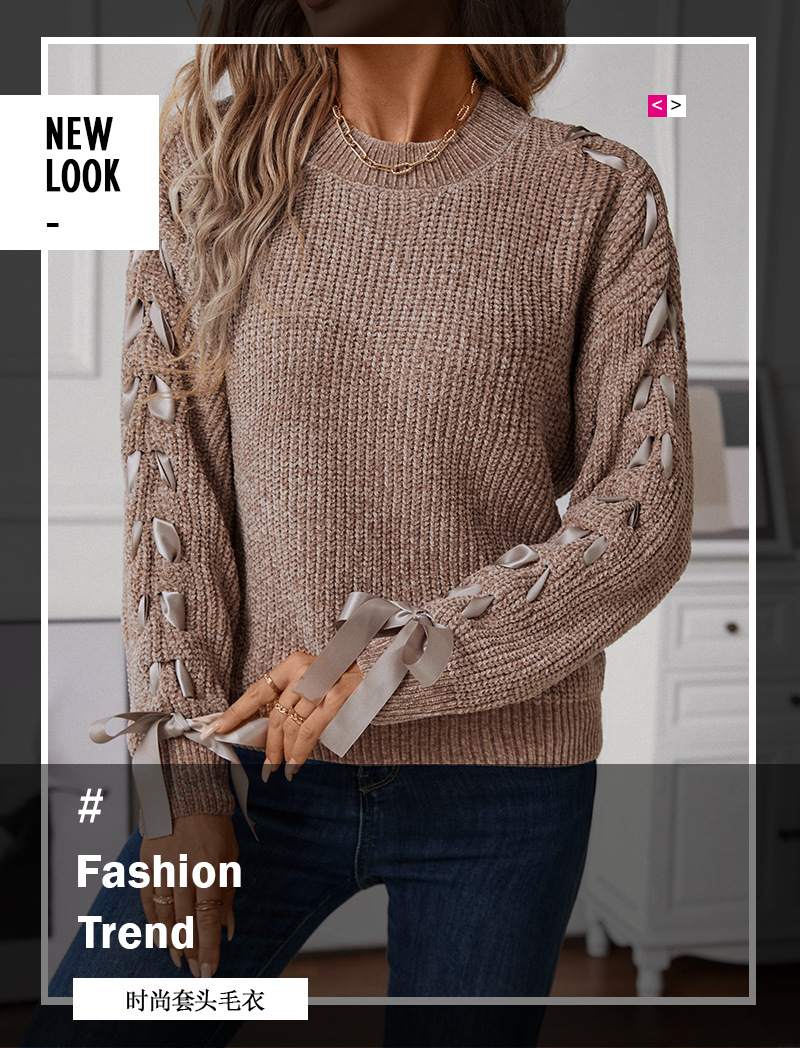 跨境亚马逊系带蝴蝶结套头秋冬毛衣宽松休闲长袖针织衫欧美女装