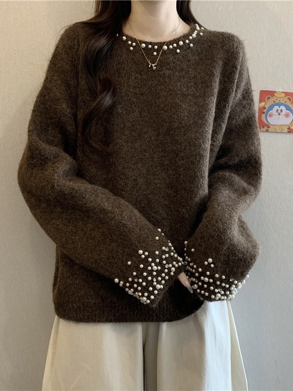 大码女装独特钉珠长袖毛衣上衣秋冬新款宽松慵懒超好看针织衫