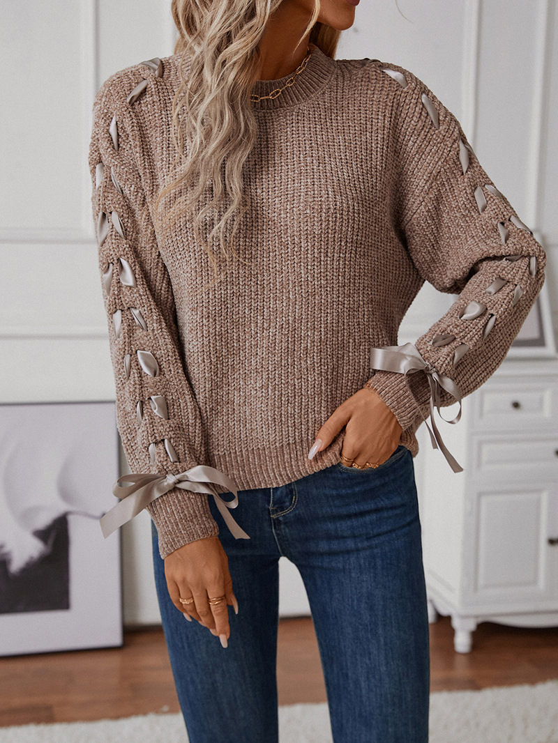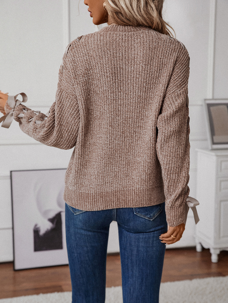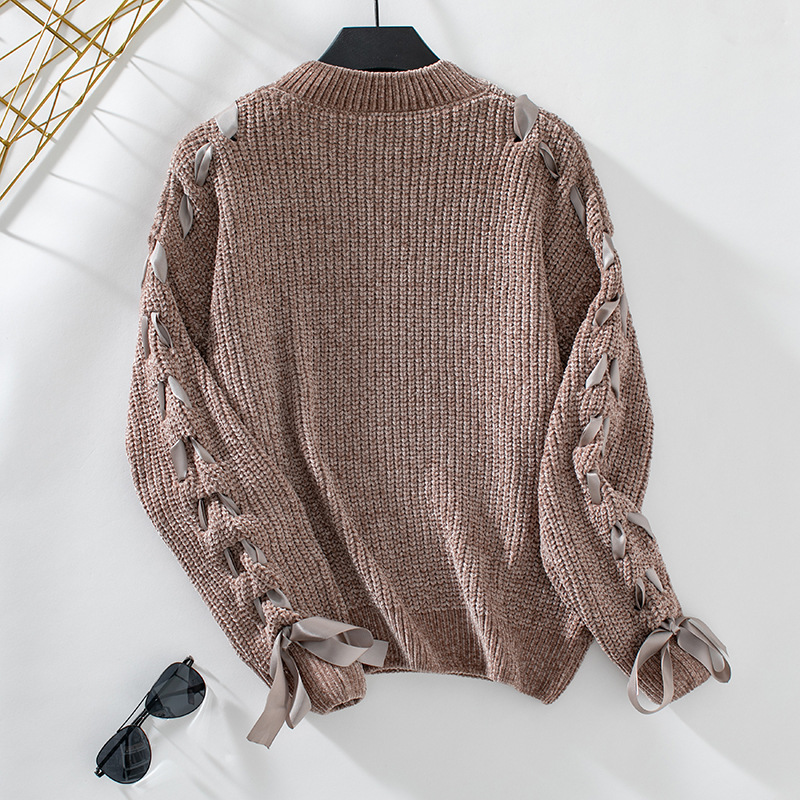 2025 外国貿易レースアップ女性のセーター秋と冬の新しいクロスボーダーヨーロッパとアメリカの無地ルーズリボンプルオーバーセーター女性用