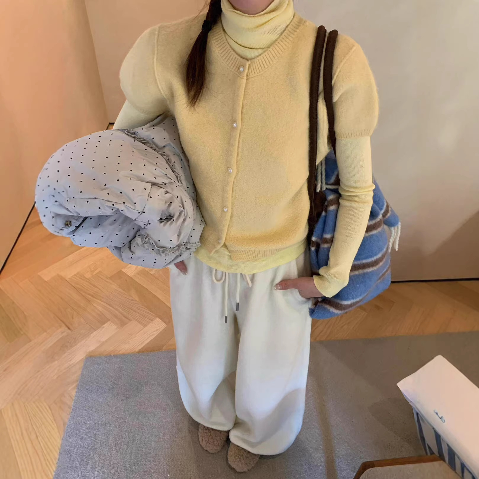 peanut 花生家韩系春季温柔气质珍珠扣泡泡袖短款软糯开衫毛衣女