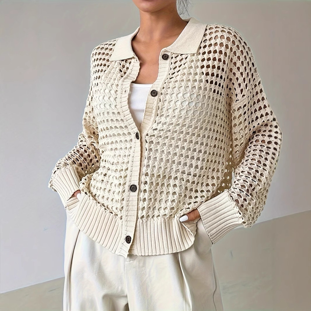春秋の新女性中空ニットソリッドエレガントな休暇長袖シングルブレストニットカーディガンセーター女性