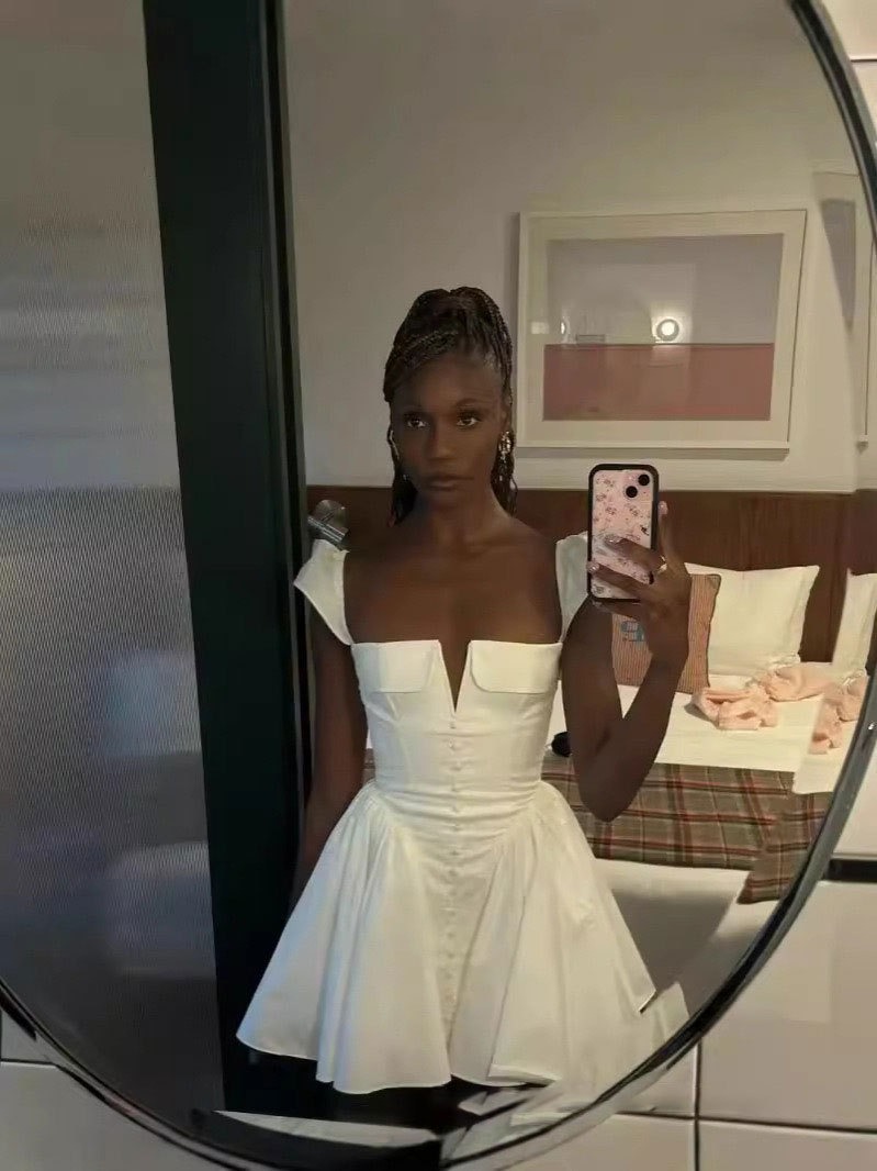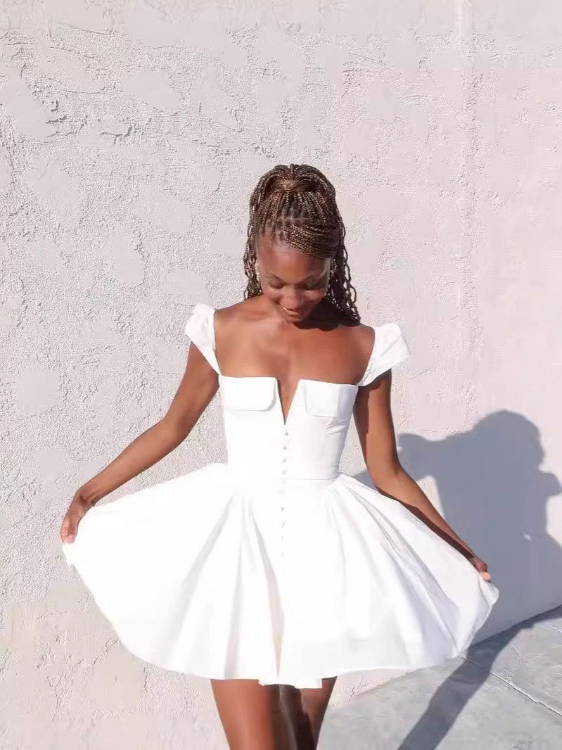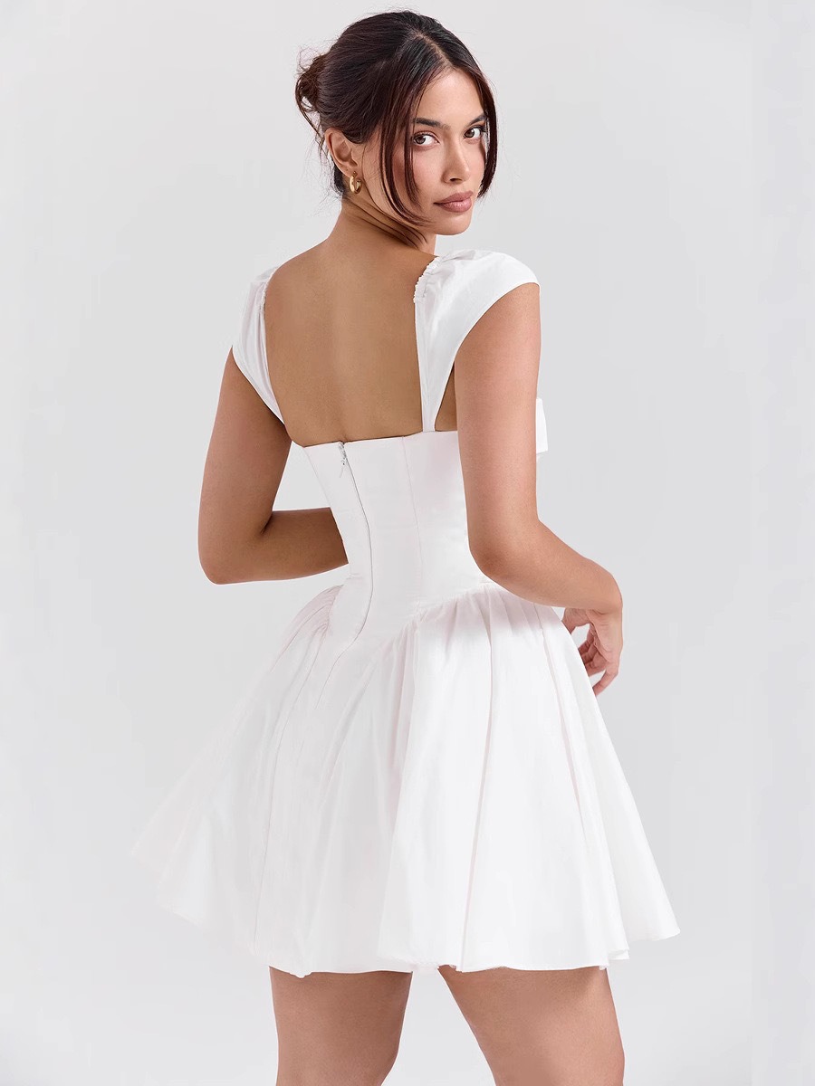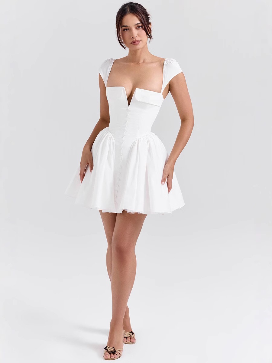 外国貿易の爆発的な気質vネックの白いa字のスカートの高腰の欧米風はやせているセクシーなワンピースの快適な通気性のスカートを現します。