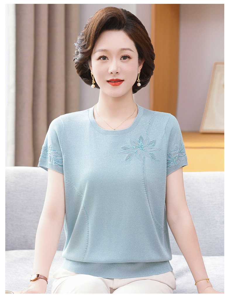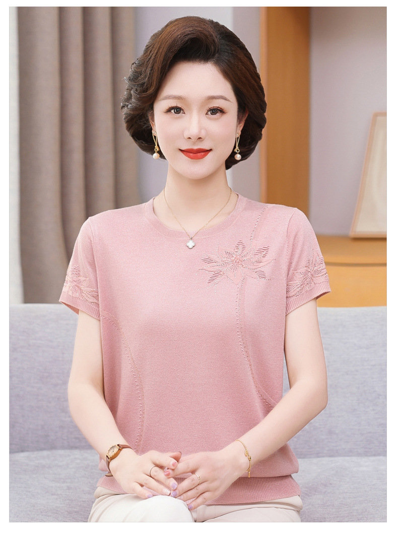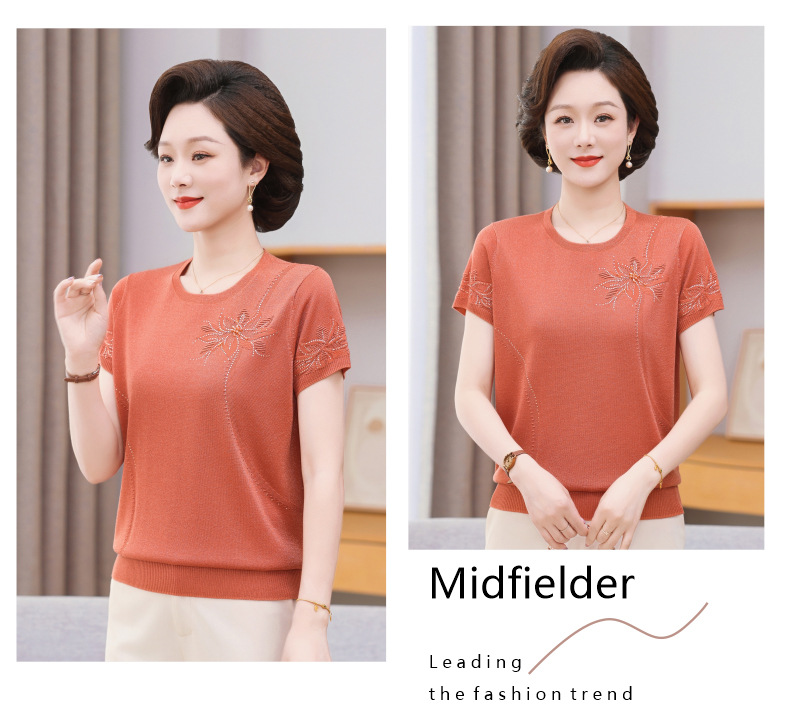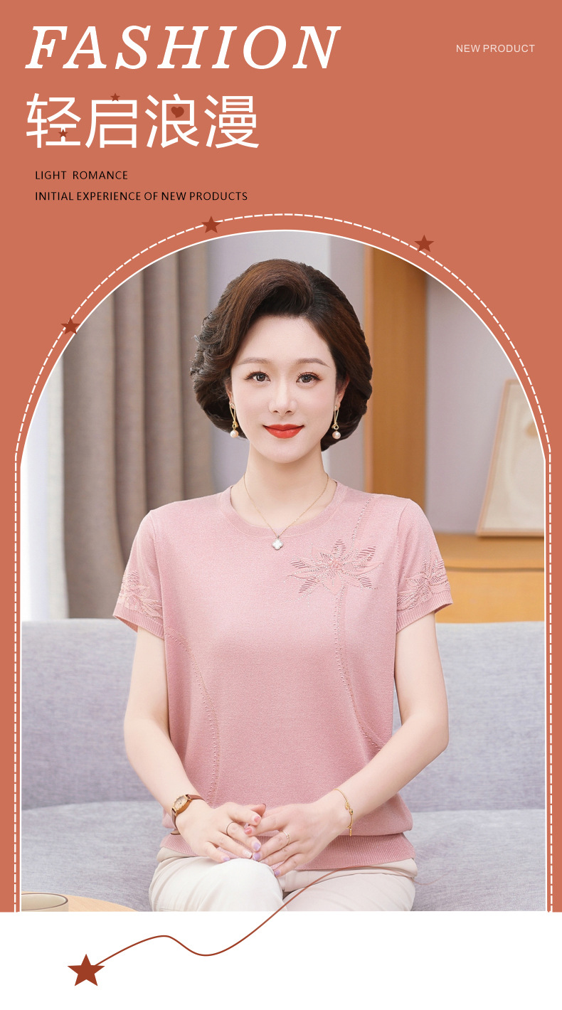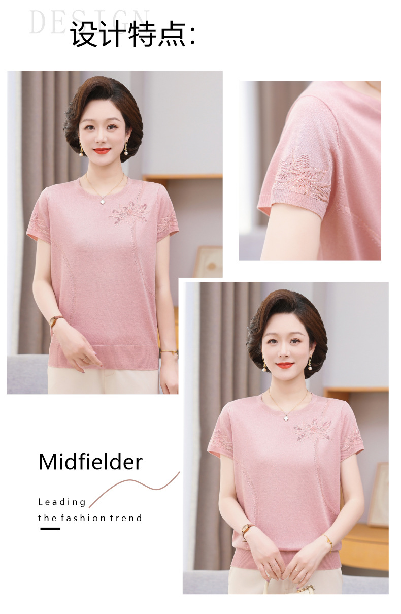 お母さんの夏服の半袖の氷糸のtシャツの洋風の小さいシャツの2025新型の中高年の女性の薄いタイプのファッションのニットの上着
