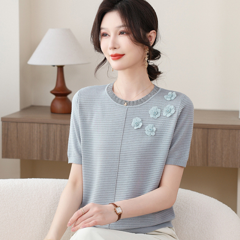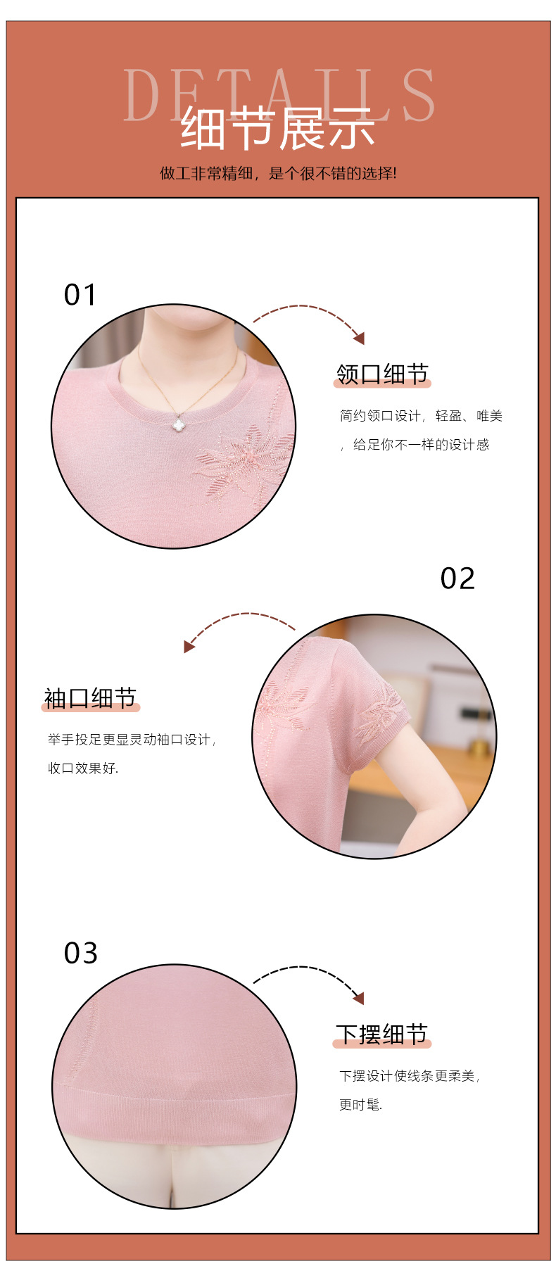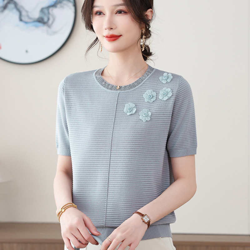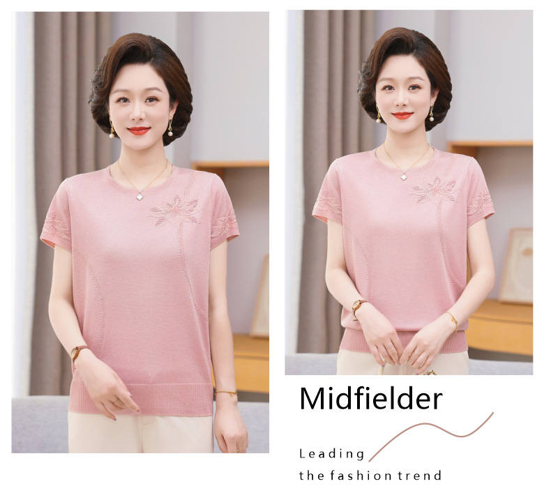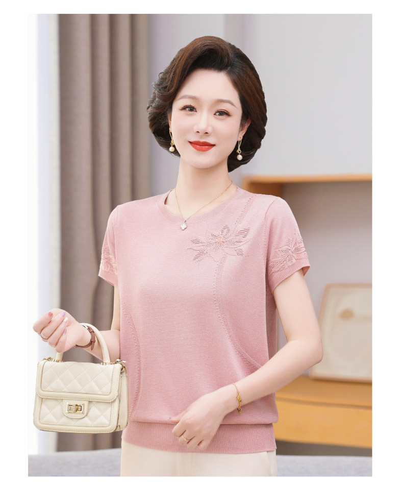 お母さんの夏服の半袖の氷糸のtシャツの洋風の小さいシャツの2025新型の中高年の女性の薄いタイプのファッションのニットの上着