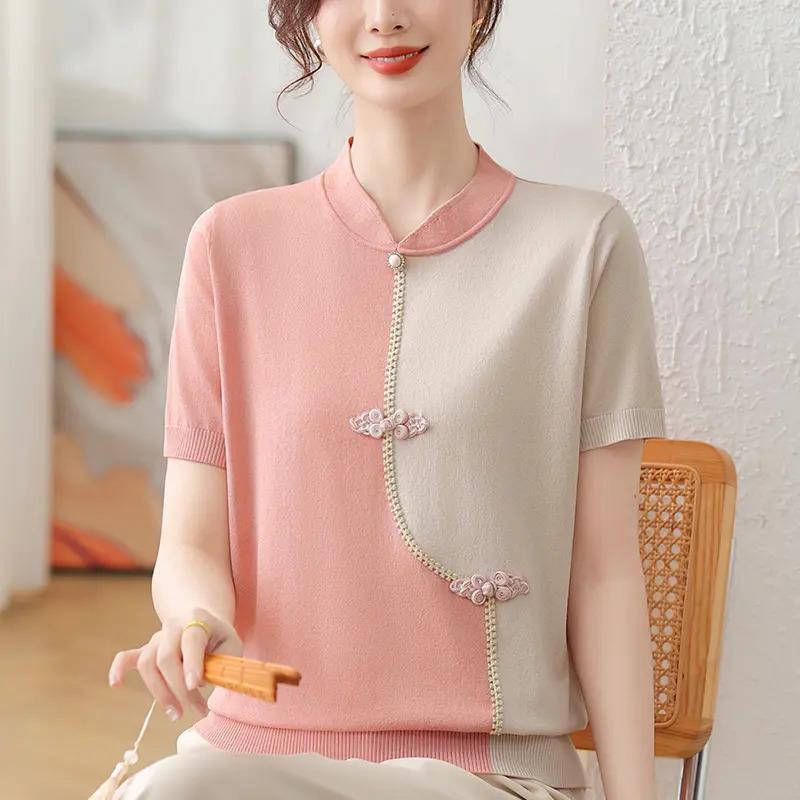 ママの夏服、新しい中国風、スタンドカラー半袖セーター、中高年の春夏服、おしゃれな国民風カラーブロックトップス