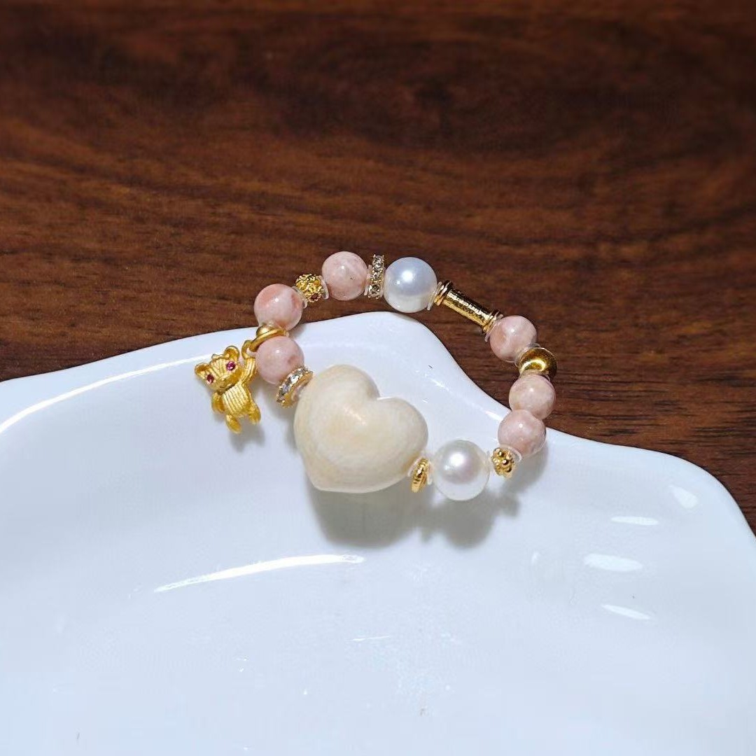 天然猛犸象牙芝士桃桃爱心戒指 搭配红纹石 天然淡水珍珠 s925银