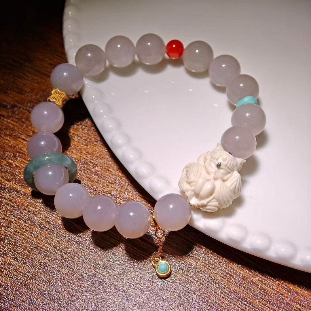 天然マンモス象牙彫刻山海経フェイフェイブレスレット、氷南紅s925銀ネズミ猿龍付き