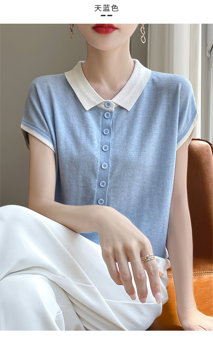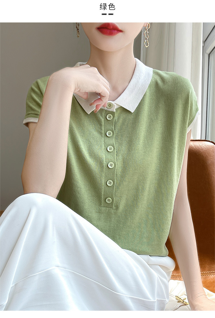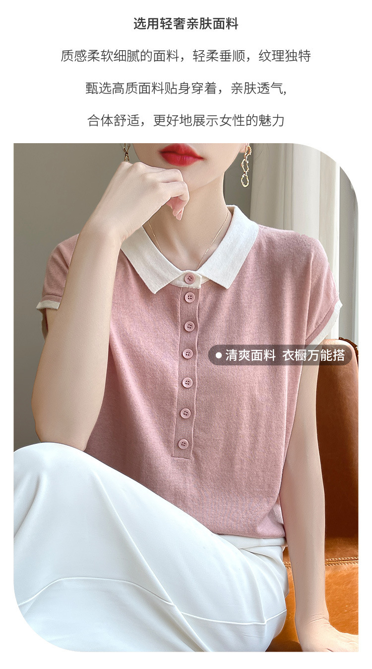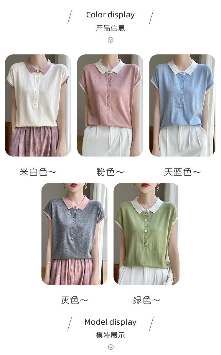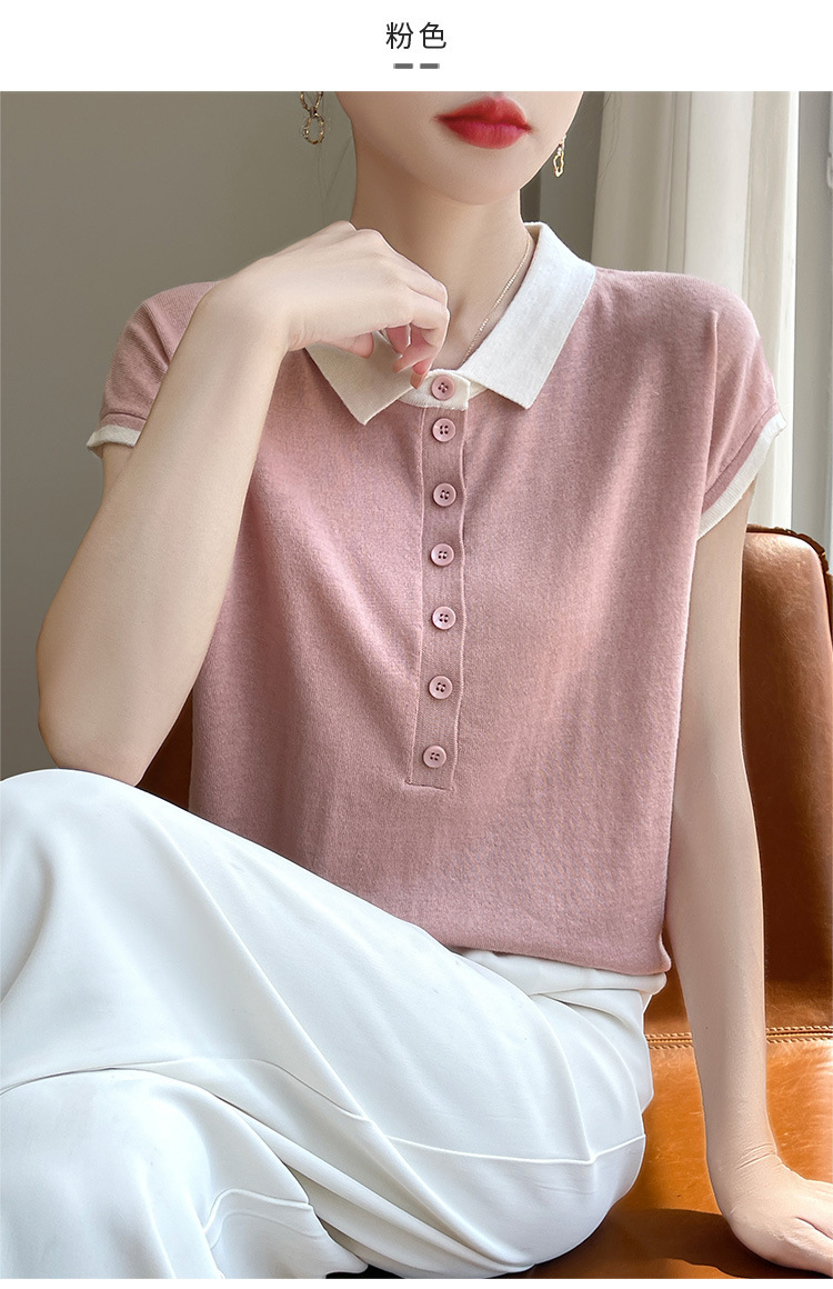 夏の新型天糸ライゼルPOLO襟ニットボタン半袖女性衝突色気質ゆるいカジュアル上着