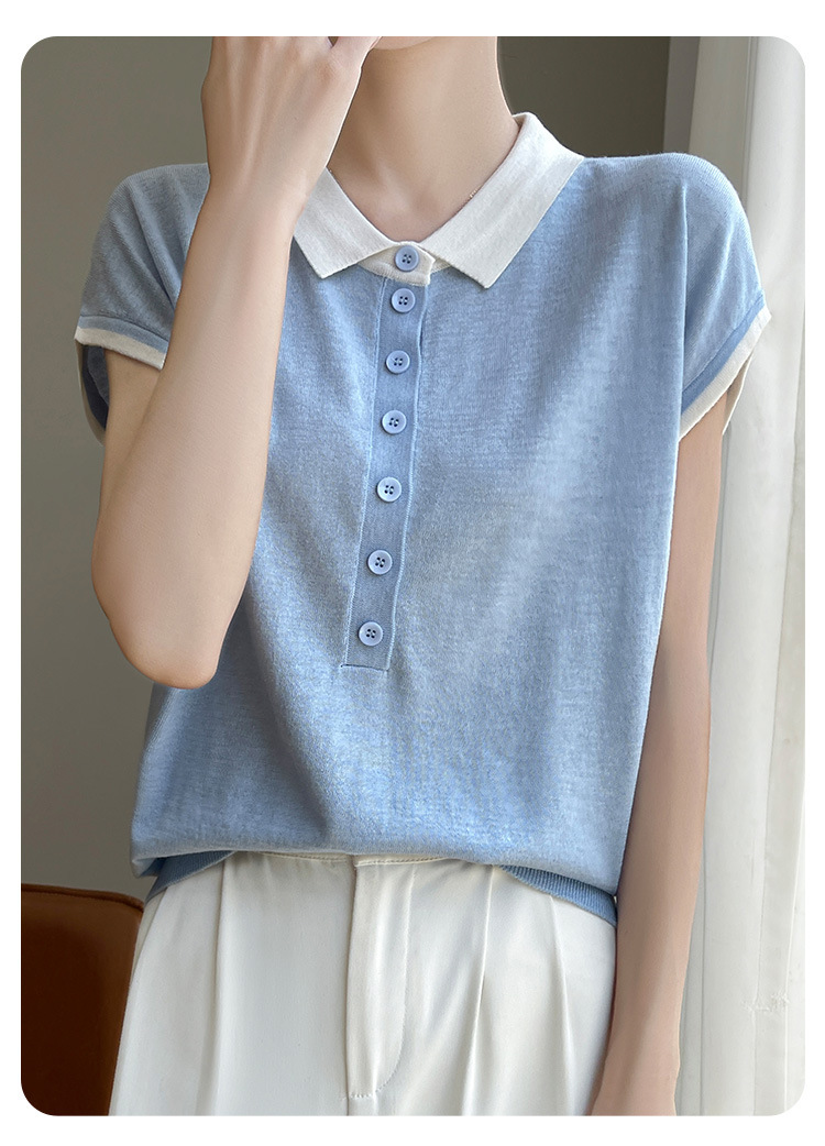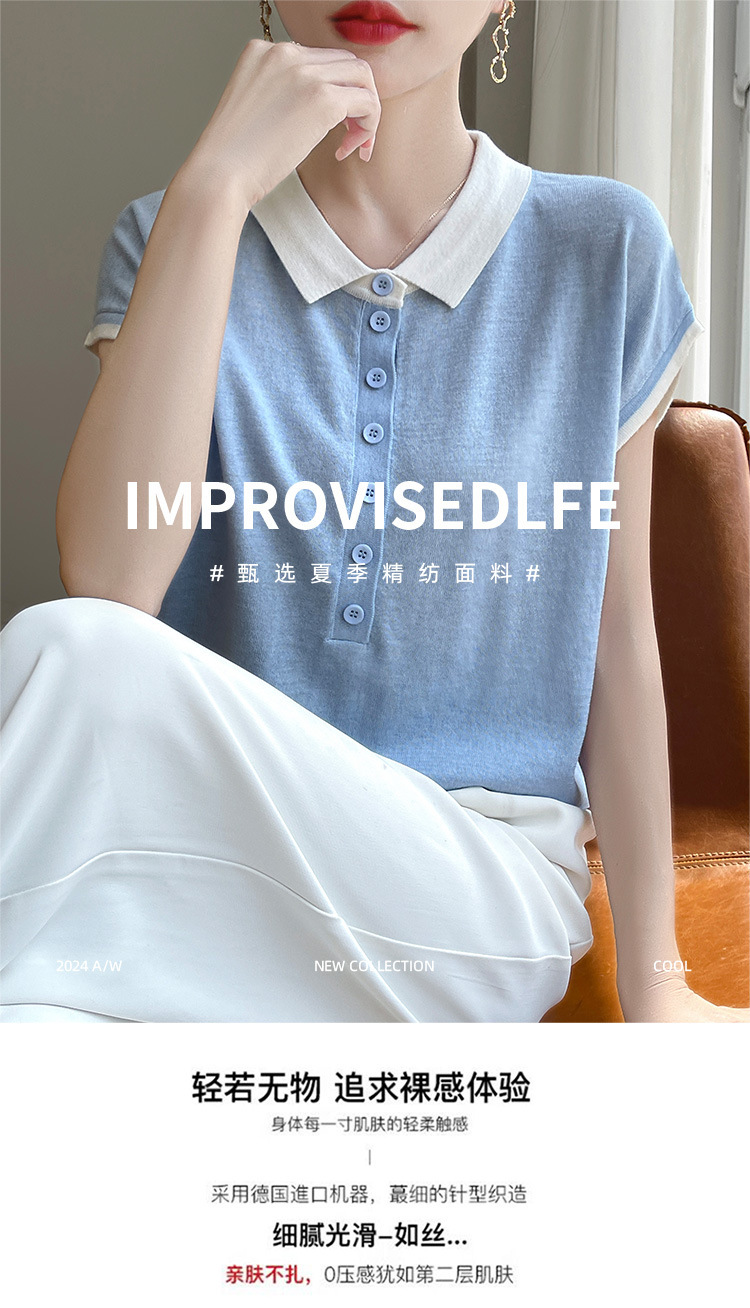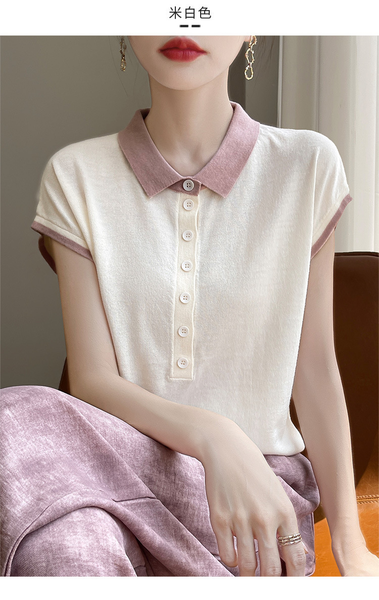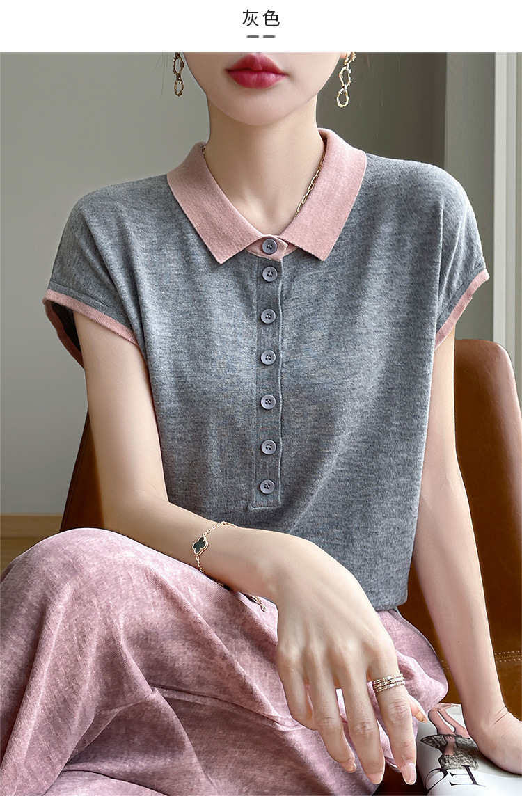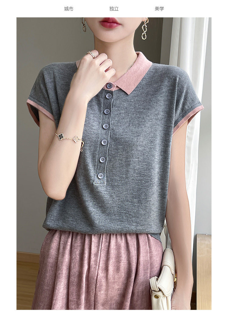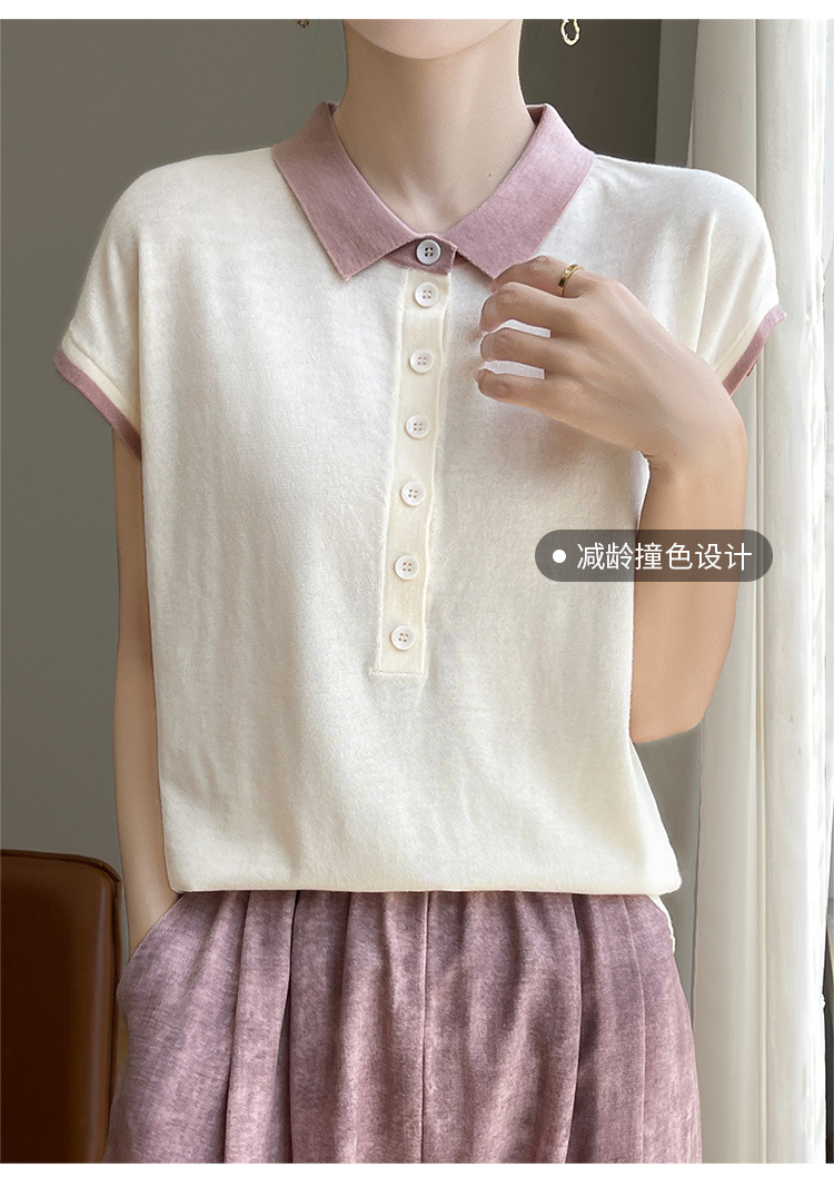 夏の新型天糸ライゼルPOLO襟ニットボタン半袖女性衝突色気質ゆるいカジュアル上着