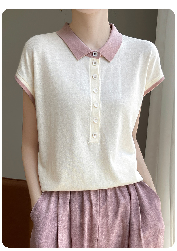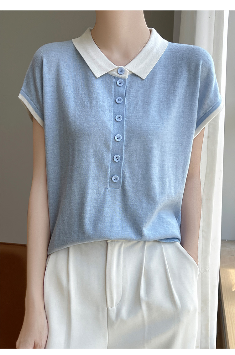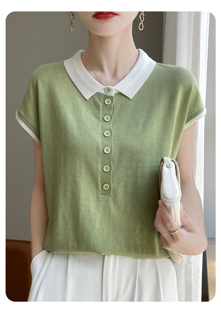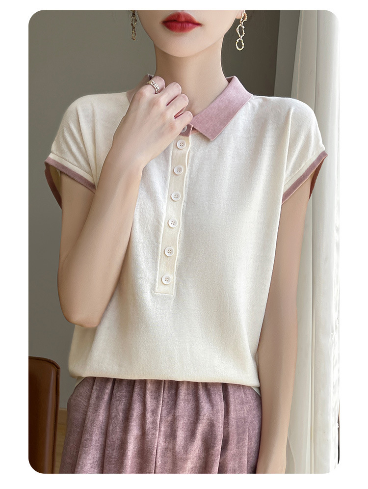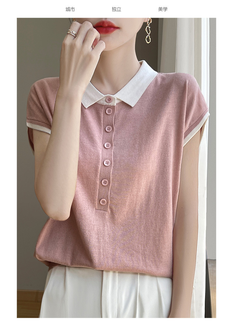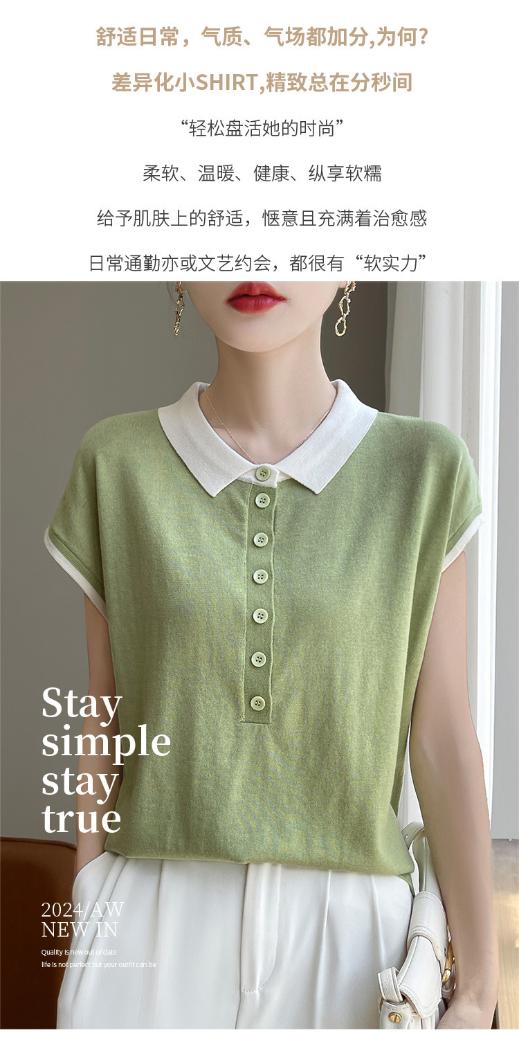 夏の新型天糸ライゼルPOLO襟ニットボタン半袖女性衝突色気質ゆるいカジュアル上着