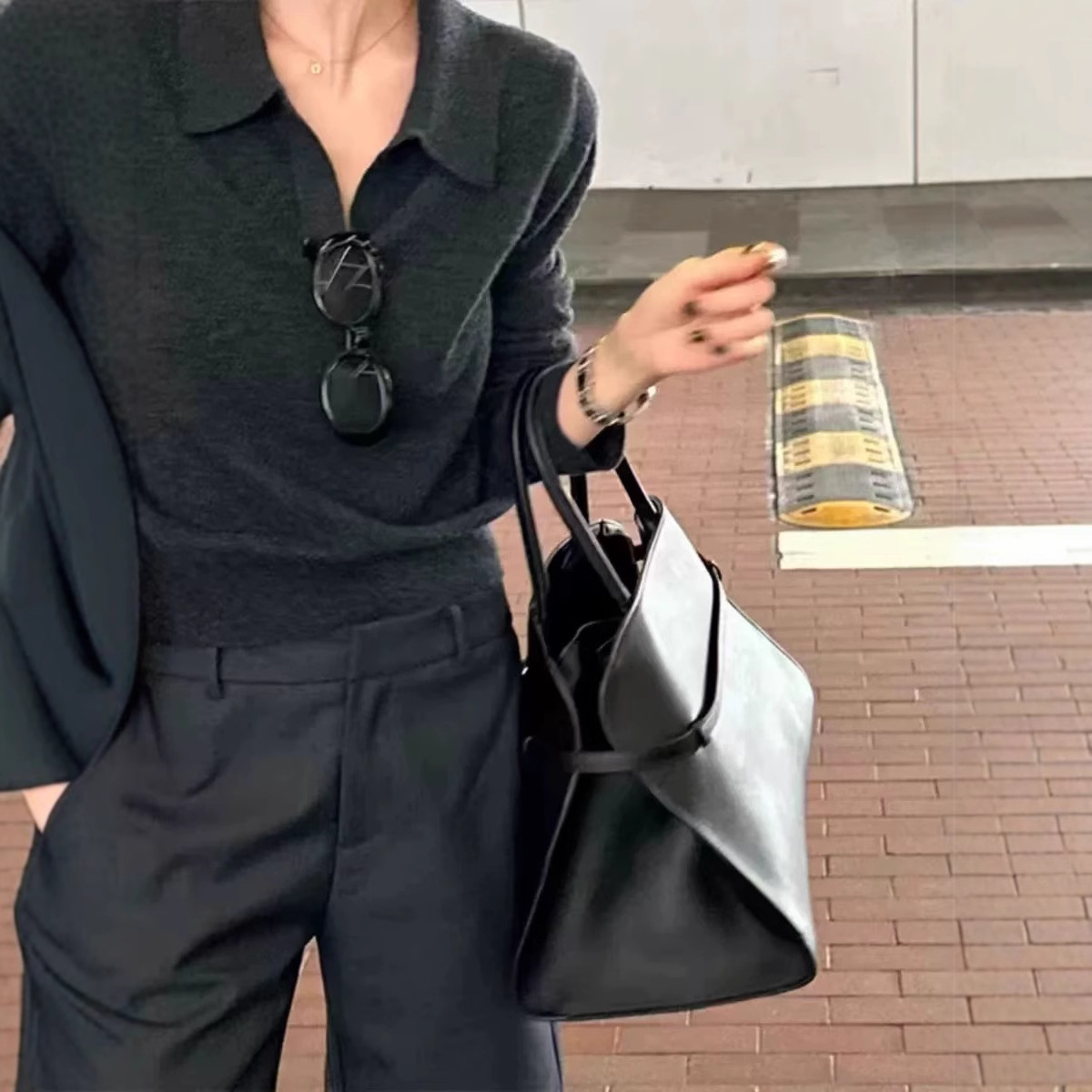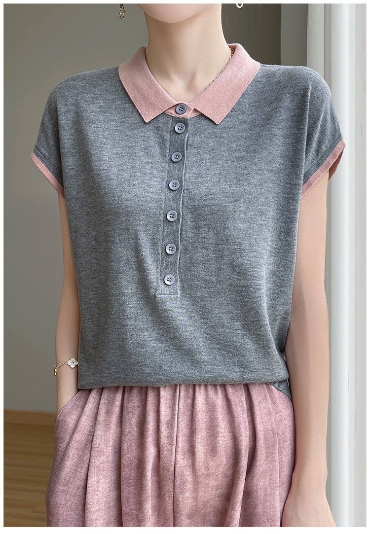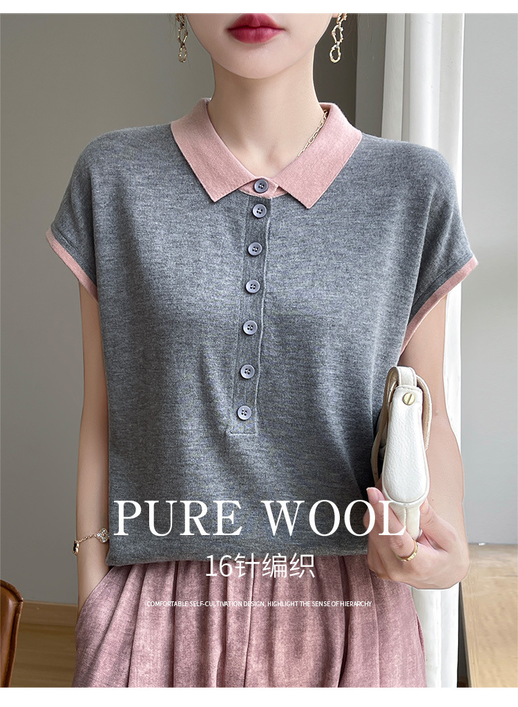 气质简约灰色短款POLO领精纺羊毛针织女春秋宽松薄款翻领·打底衫