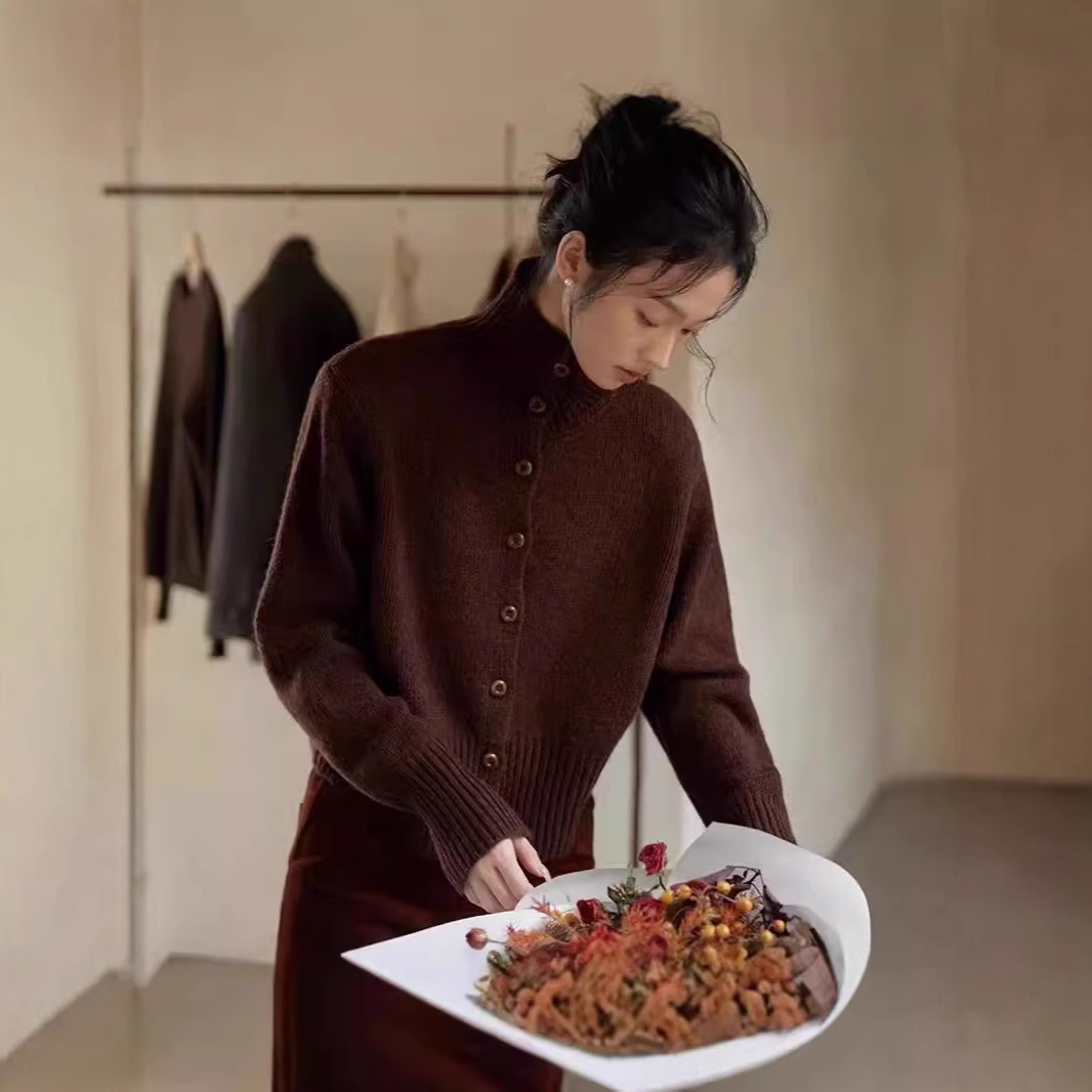 欧範洋気秋冬100ウールカーディガン女性高襟の短い上着カシミヤ立襟セーターコート