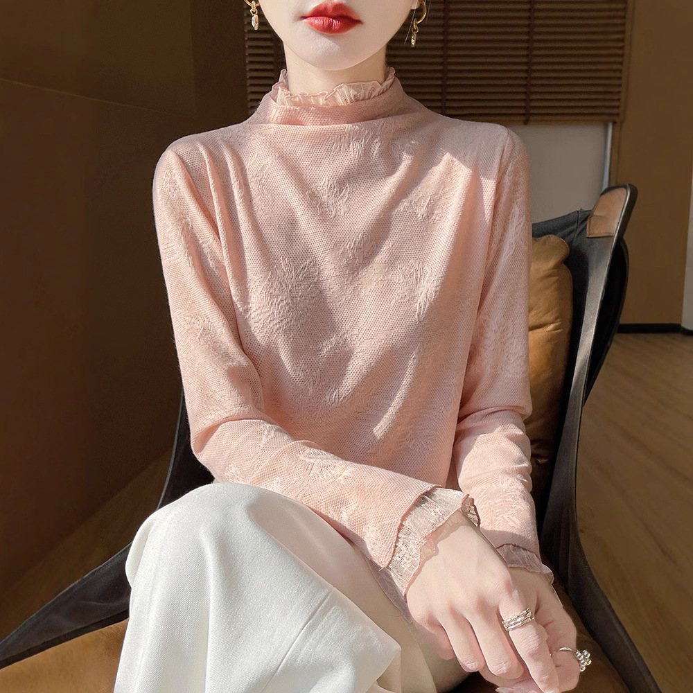 2025春の新商品の紡績透かし彫りの女性は外に欧根の紗を着て長袖のレースの半高襟の頭の底のシャツをつなぎ合わせます。