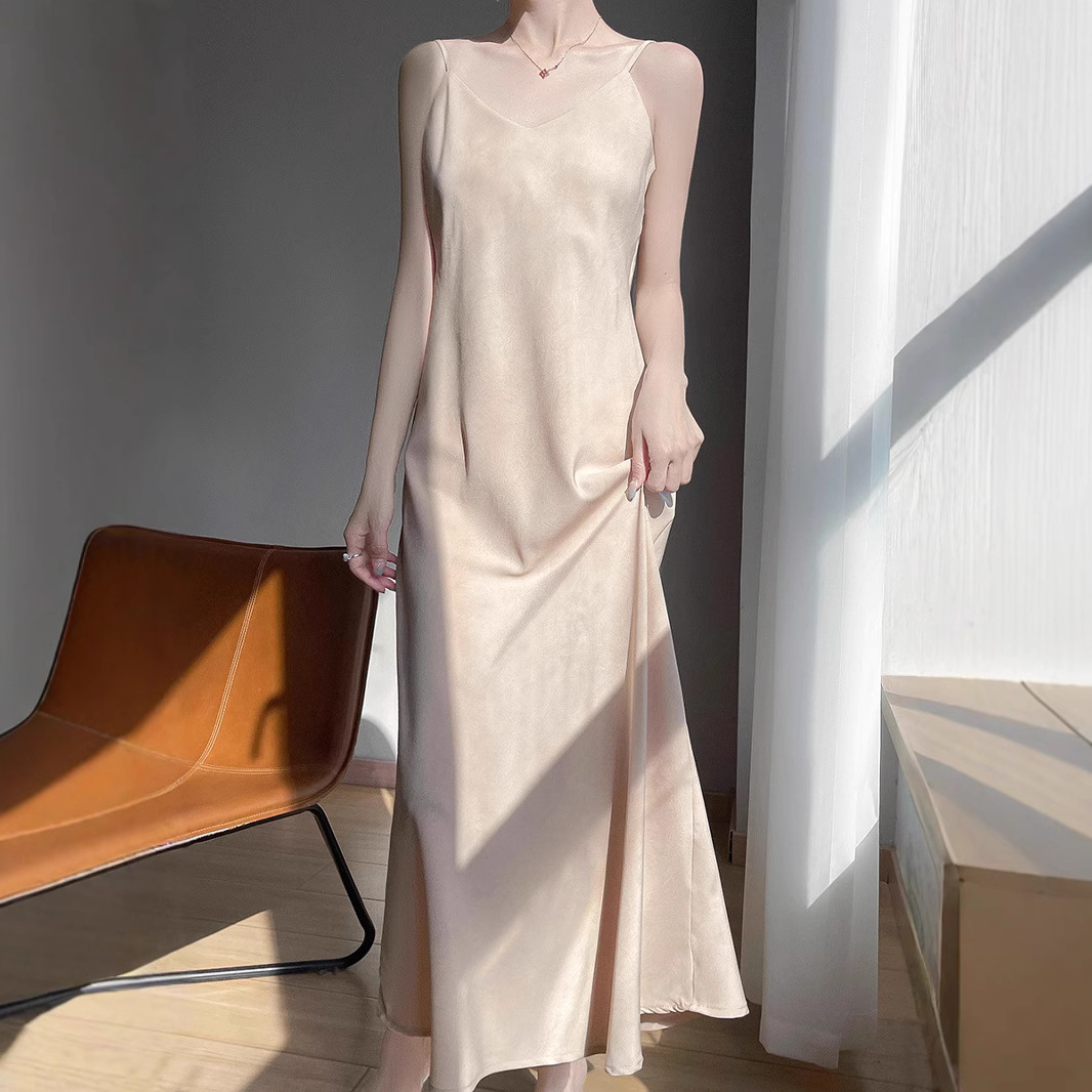 2025年フランス百合女性酢酸ストラップワンピース手掴み花vネックストラップスカートサテンロングスカート卸売り