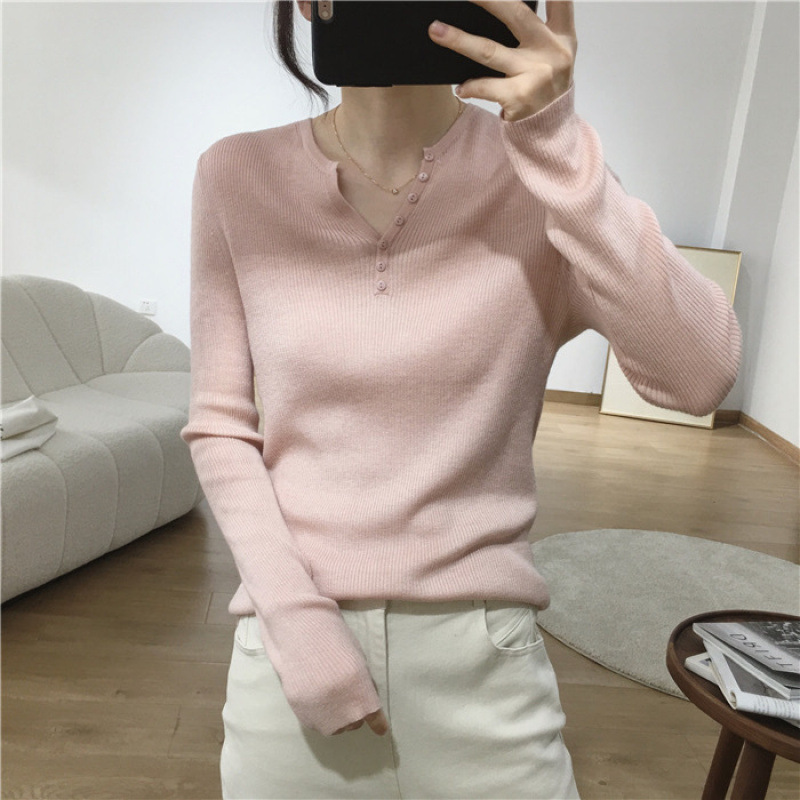 韓国版の柔らかいモチモチとした百合の小さい透き通った丸首のウールのニットの女性の24春秋のゆったりしているセーターのvネックの底のシャツの薄いタイプ