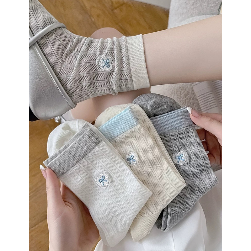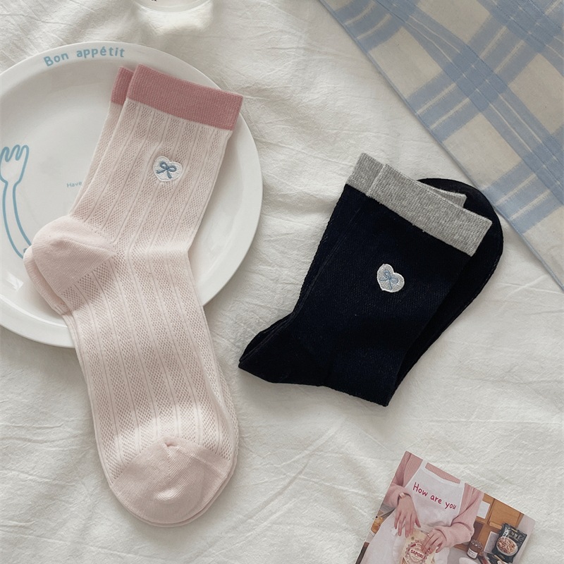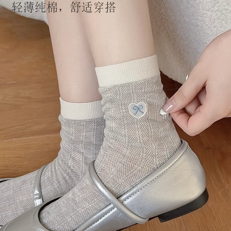 靴下の女性の薄い綿の目の中のストッキングの愛の蝶結びの刺繍は色の積み重ねの靴下の夏の通気性の靴下にぶつかります。