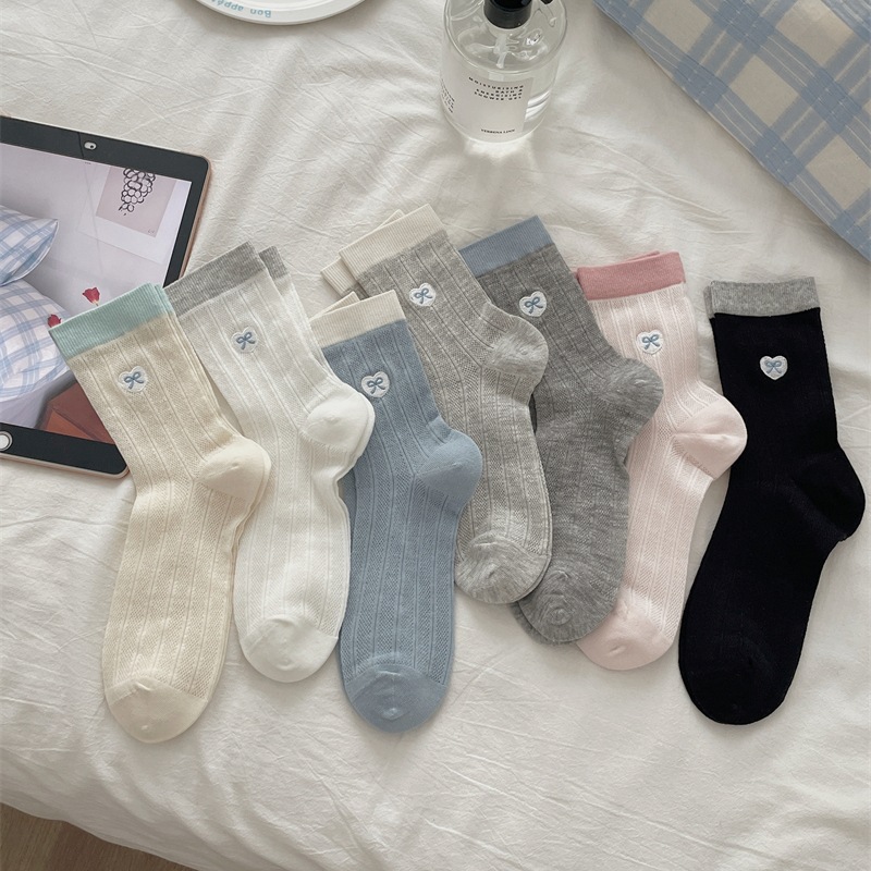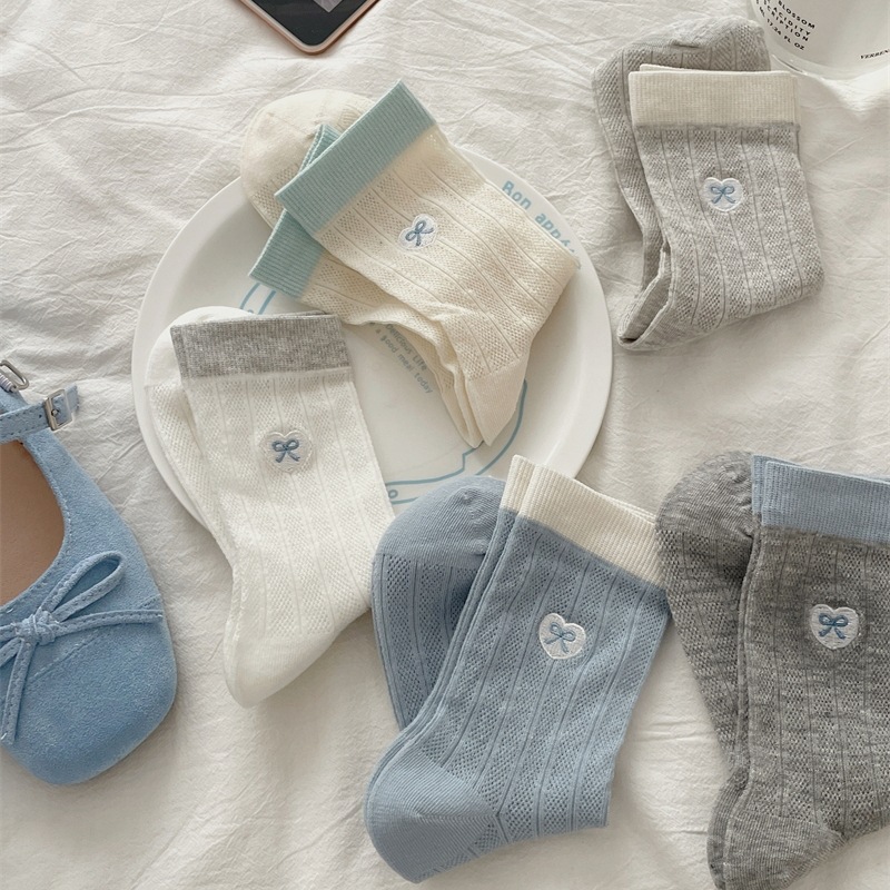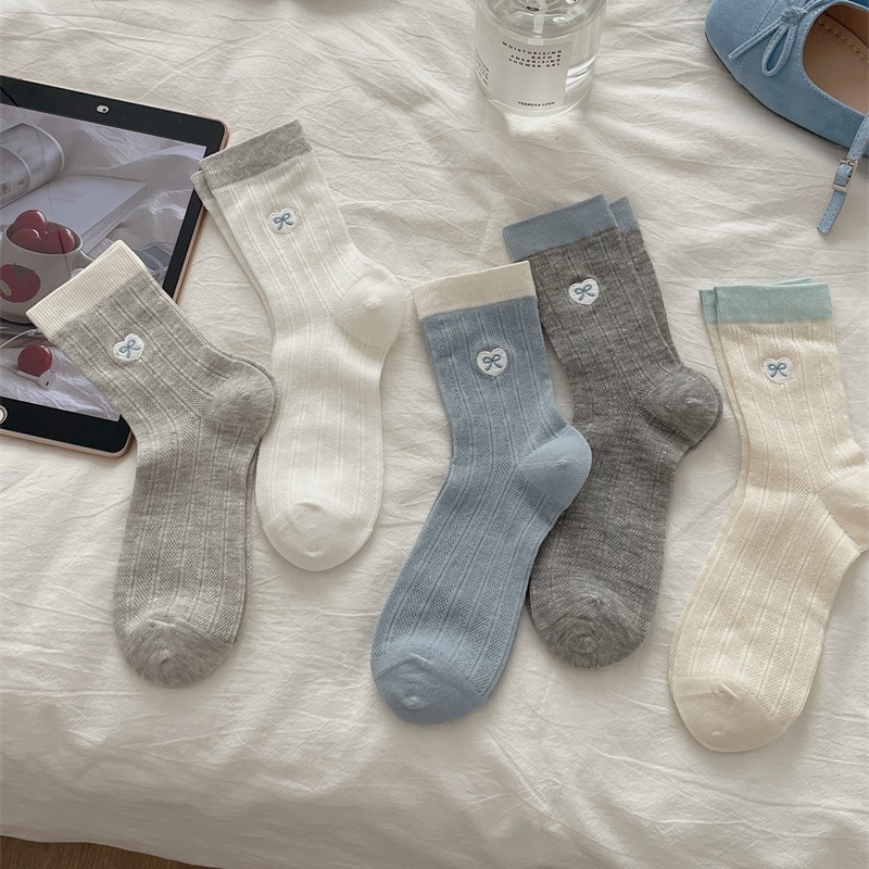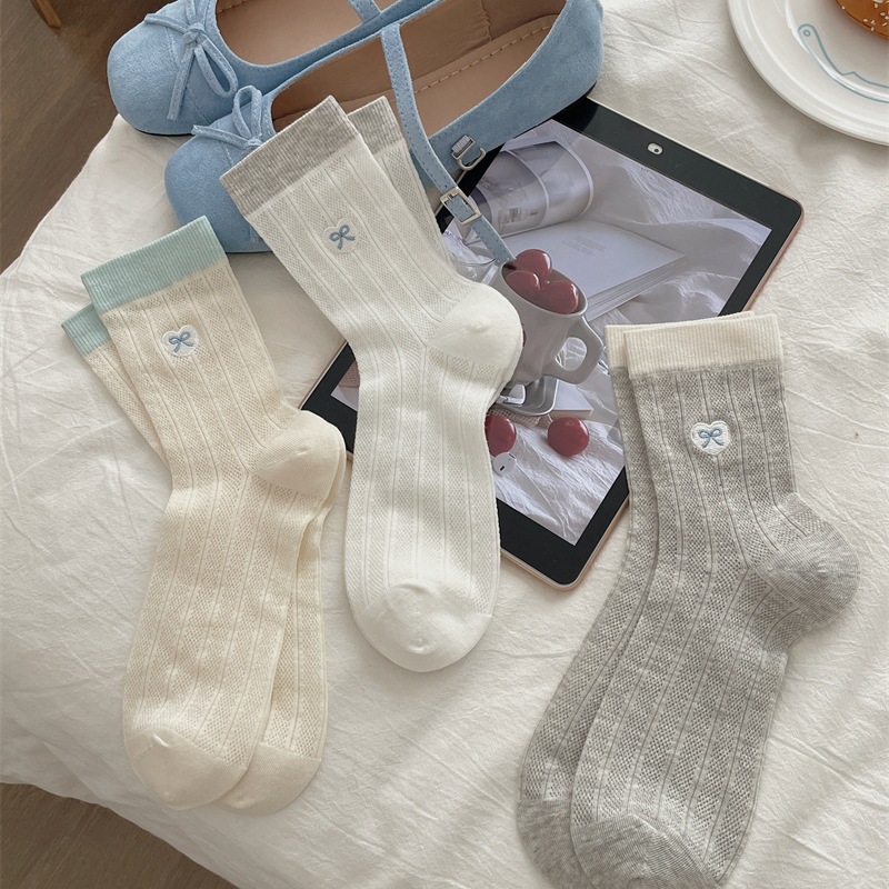 韓国系ins蝶結び刺繍春夏女性靴下中筒靴下積層靴下日系復古韓国版純綿靴下子供