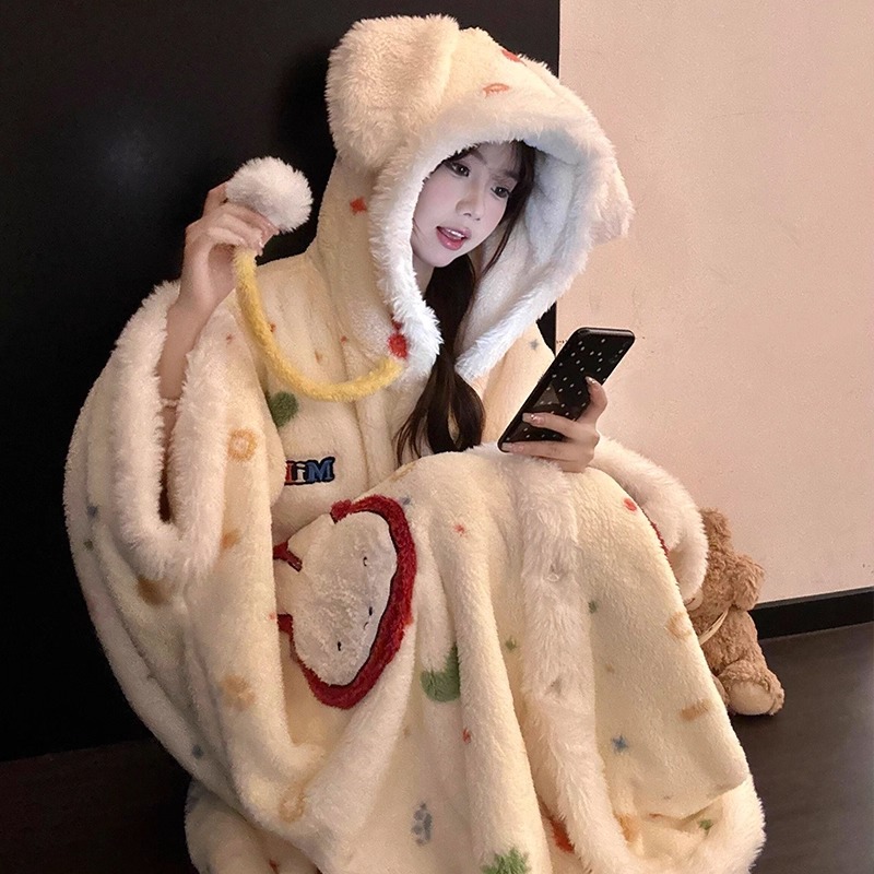卡通少女米菲兔加绒加厚珊瑚绒斗篷睡袍秋冬季保暖家居服睡衣套装