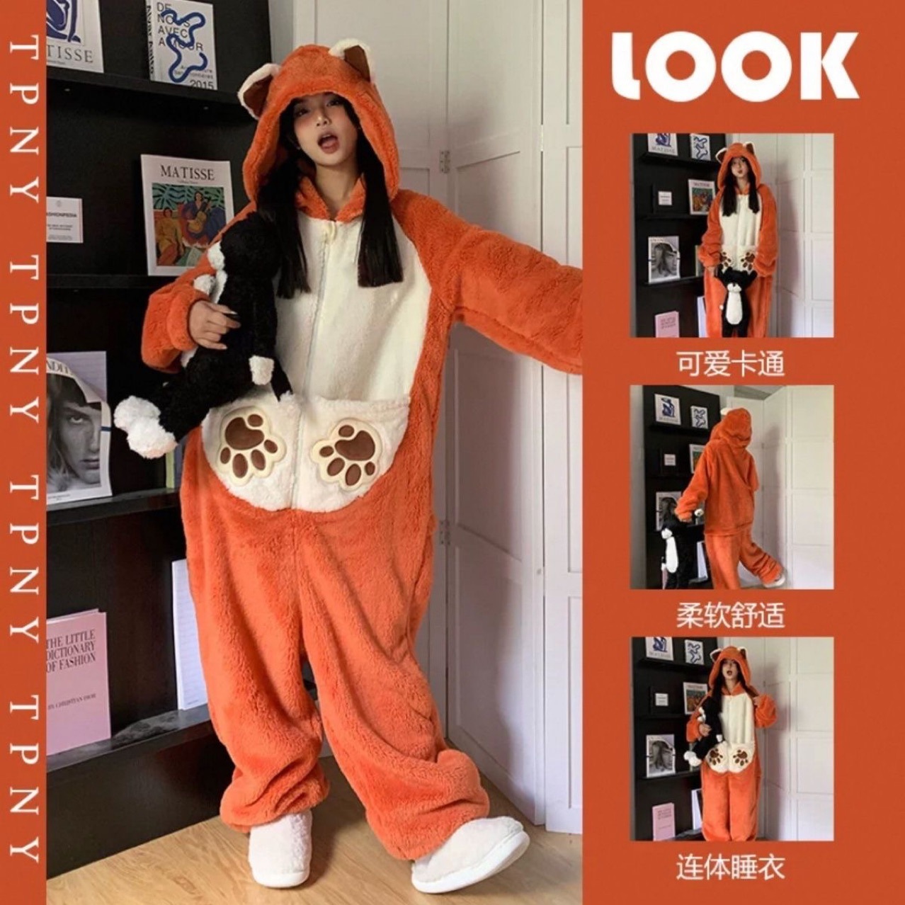 连帽睡衣女士秋冬季珊瑚绒加厚珊瑚绒可爱卡通狐狸连体家居服套装