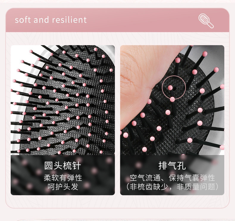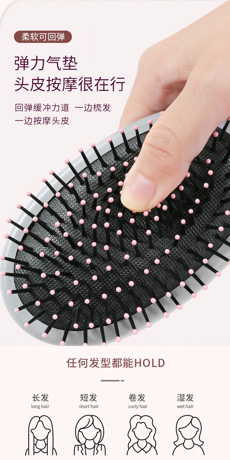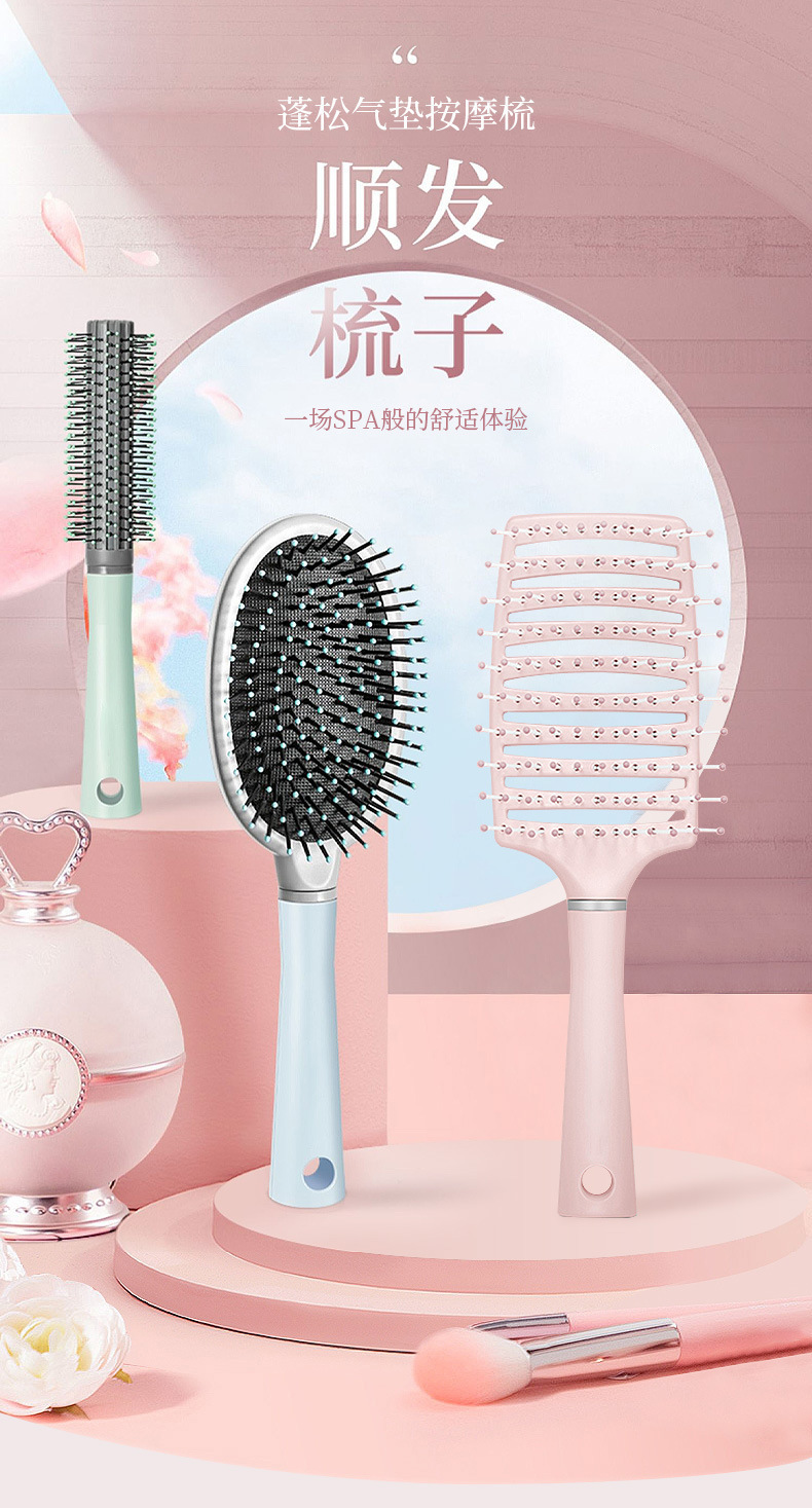 商品材质:扁梳:pp,排骨梳/卷发梳/大弯梳:pp+钢丝,气囊梳:pp+橡胶