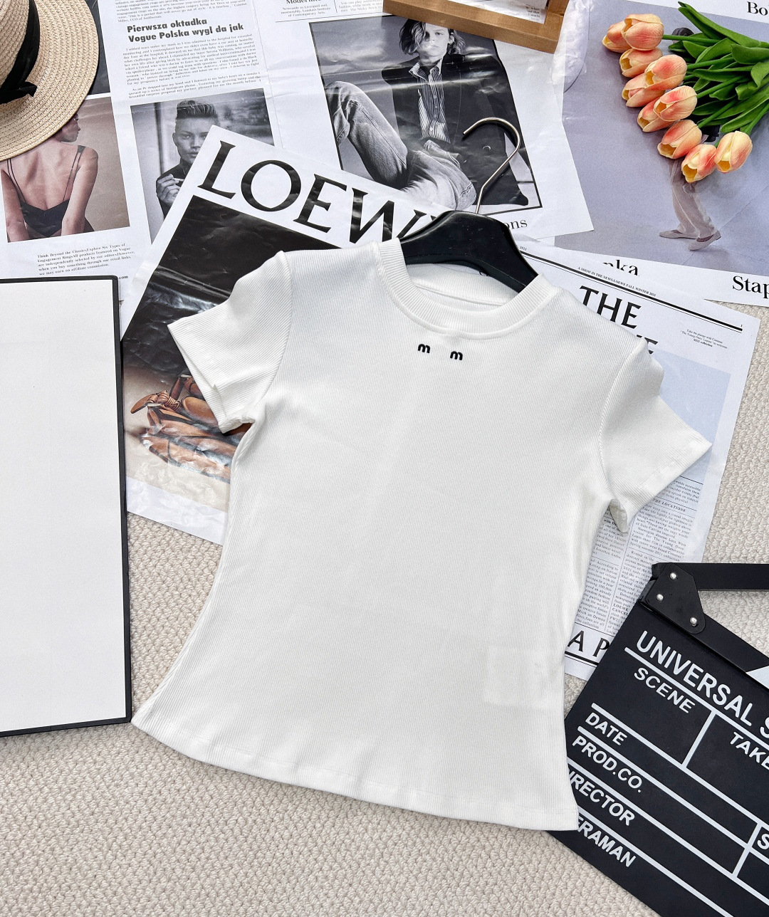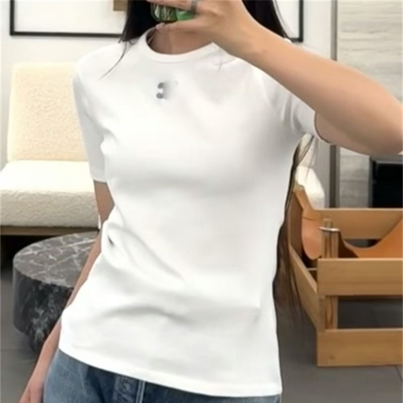 現物iu家2025夏の新型胸前アルファベットロゴ刺繍スリムスリム丸襟半袖tシャツ上着