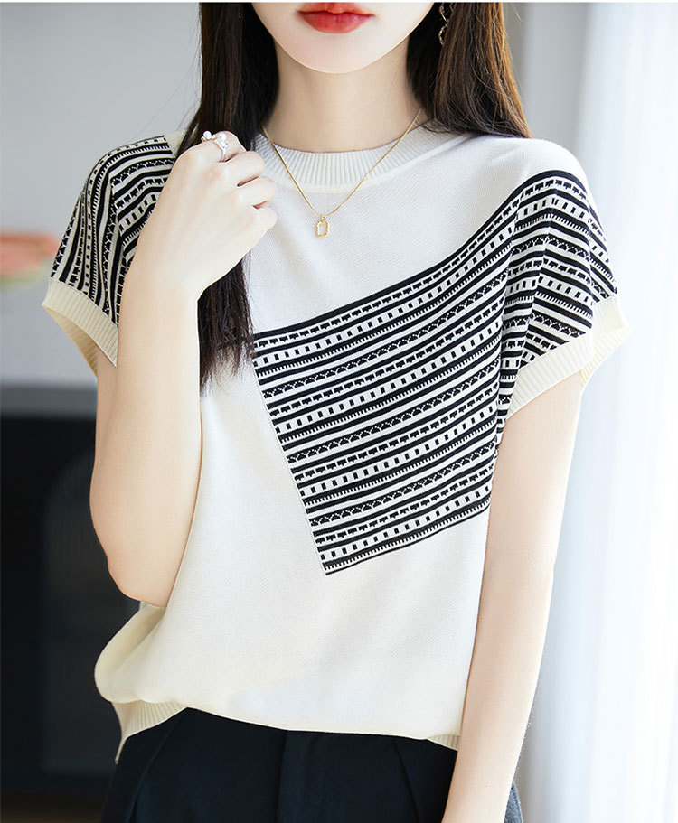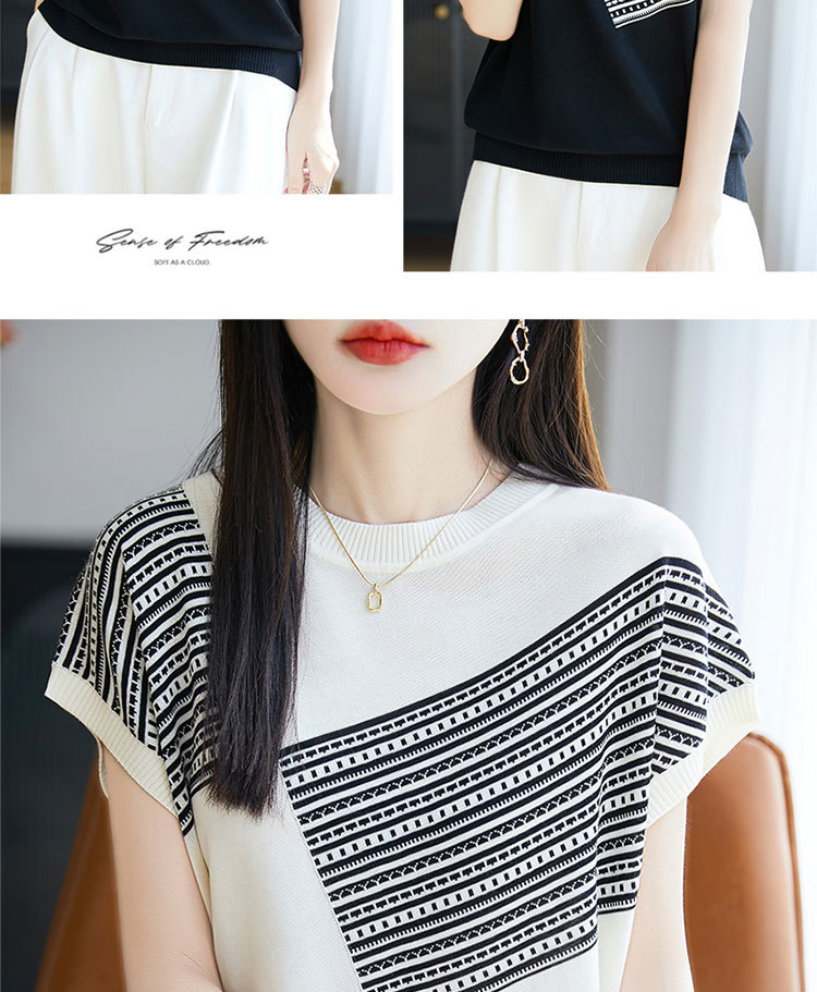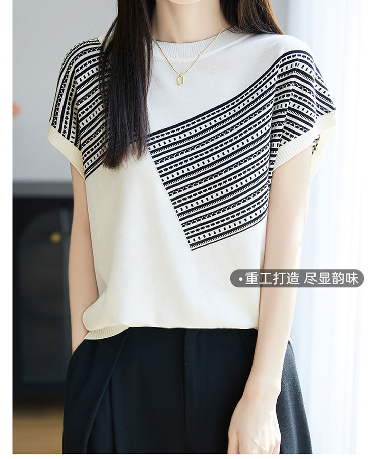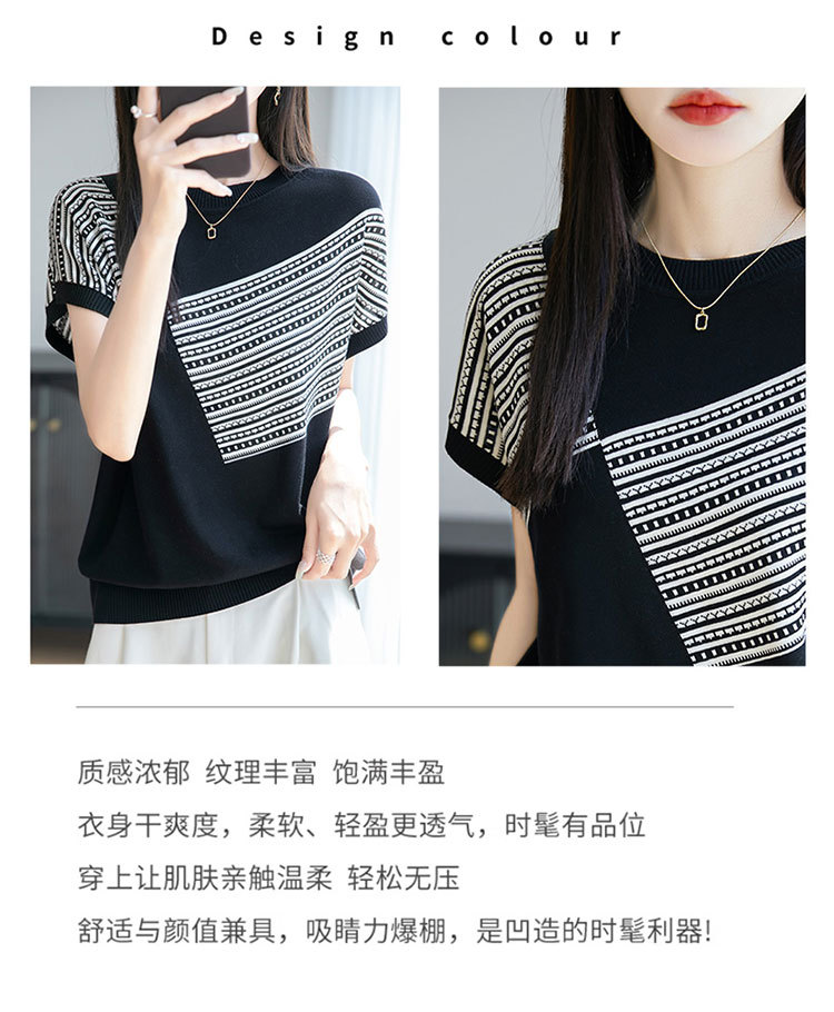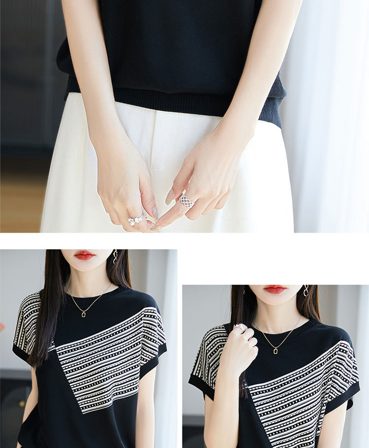 【メーカー直供】丸首の色合わせの天糸半袖tシャツ女性の夏の薄いファッションのストライプの年齢を減らすニット