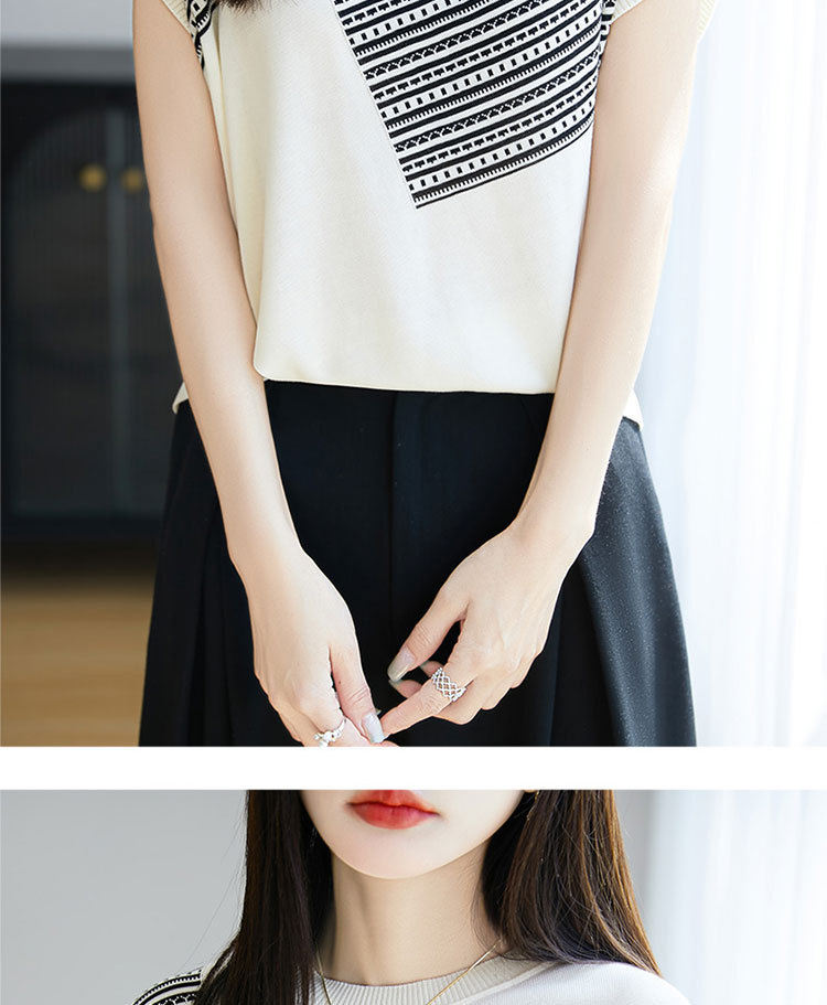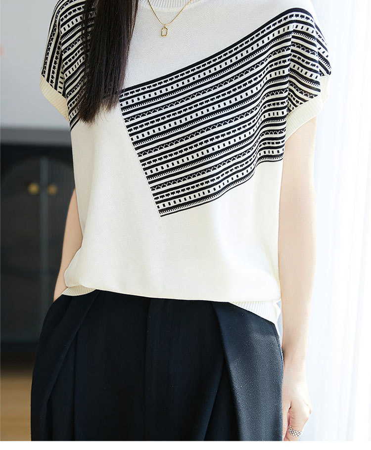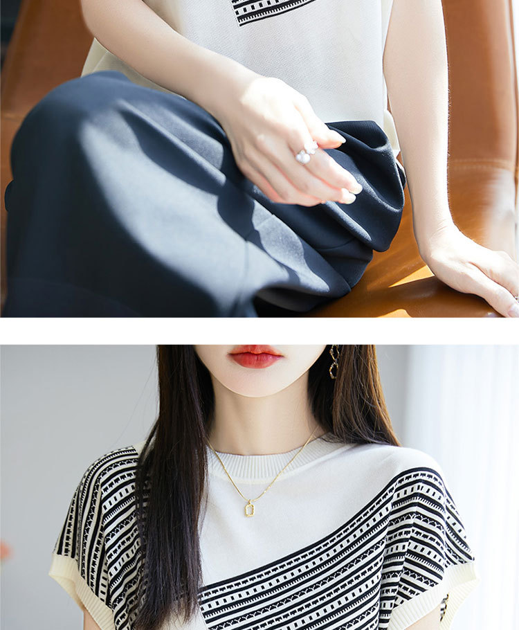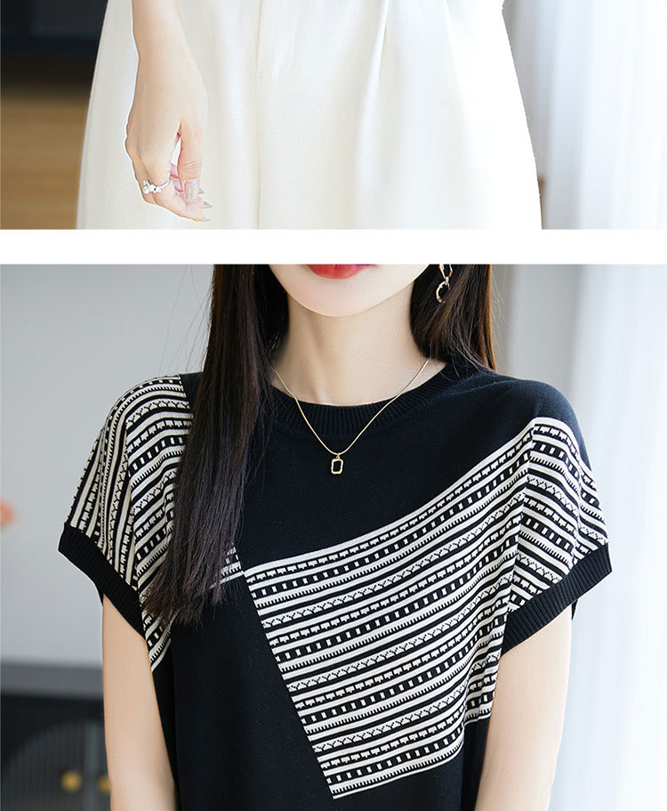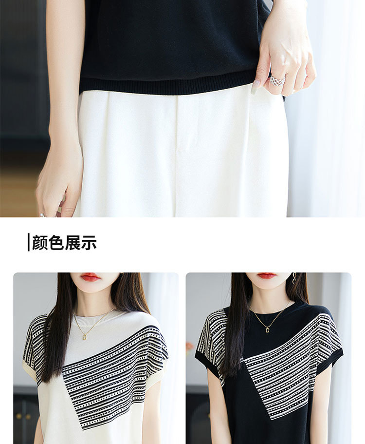 【メーカー直供】丸首の色合わせの天糸半袖tシャツ女性の夏の薄いファッションのストライプの年齢を減らすニット