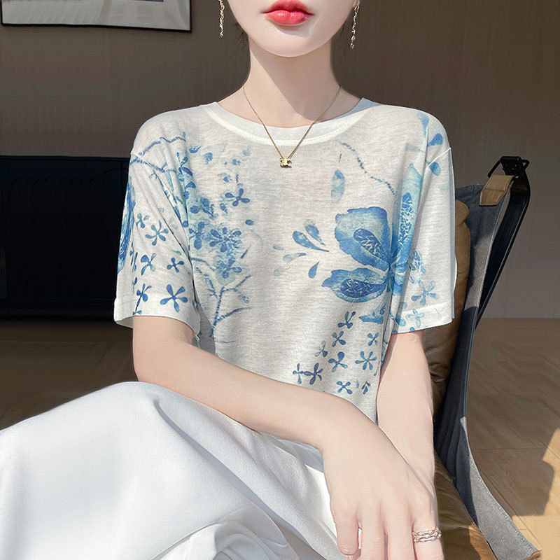 【メーカー直供】夏の薄い丸襟天糸半袖tシャツ女性ファッションプリントゆるいニット上着潮