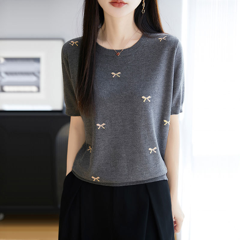 【メーカー直供】丸首天糸半袖tシャツ女性ファッション刺繍ゆるい夏の薄いニット上着潮