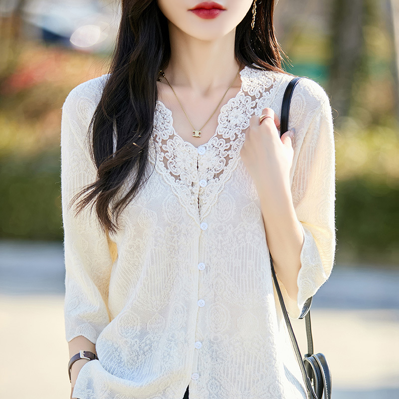 【メーカー直供】vネック天糸ニットカーディガン半袖tシャツ女性夏の色合わせジャカード抜き氷糸上着