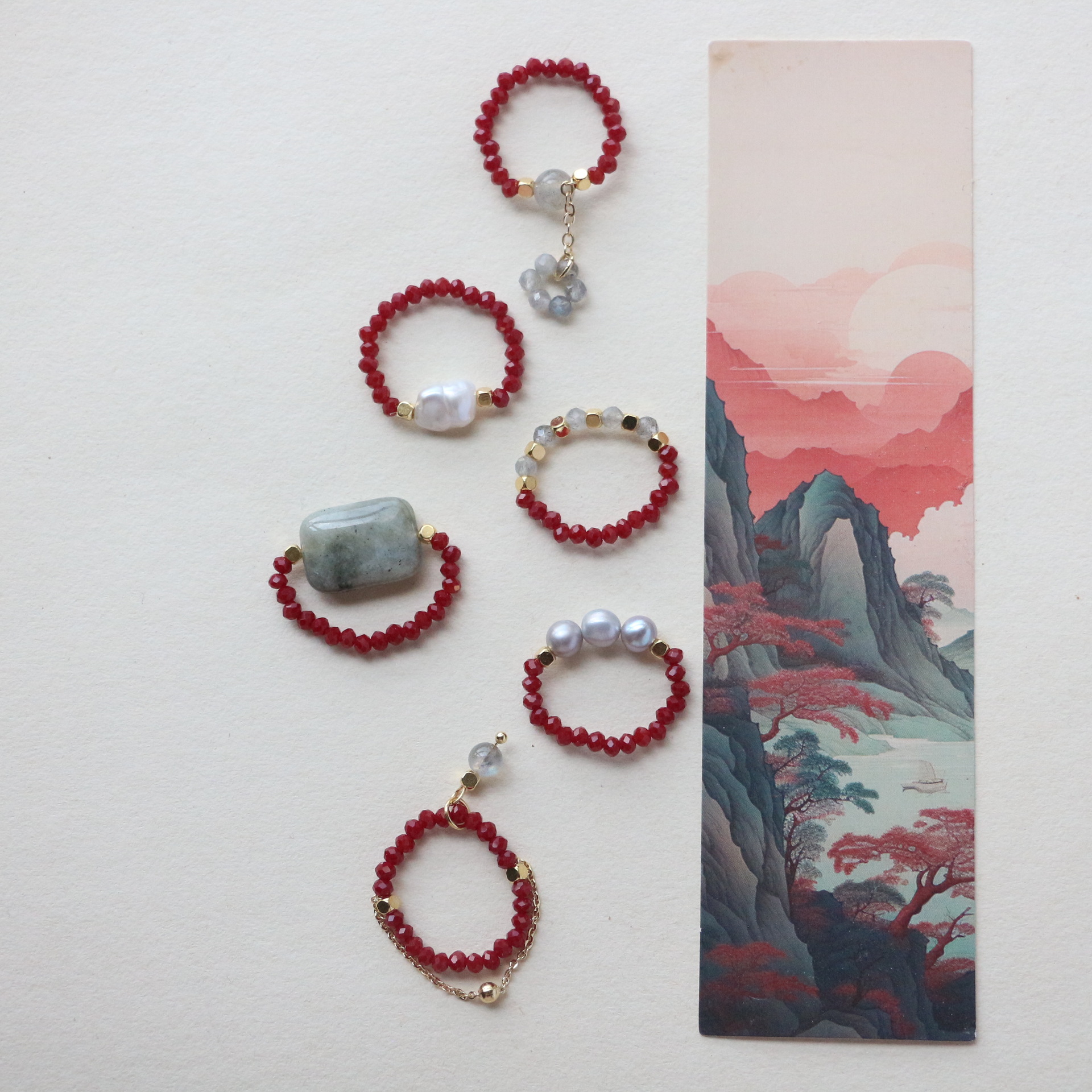 姨妈红水晶珠手工串珠弹力均码戒指 灰月光撞色搭配