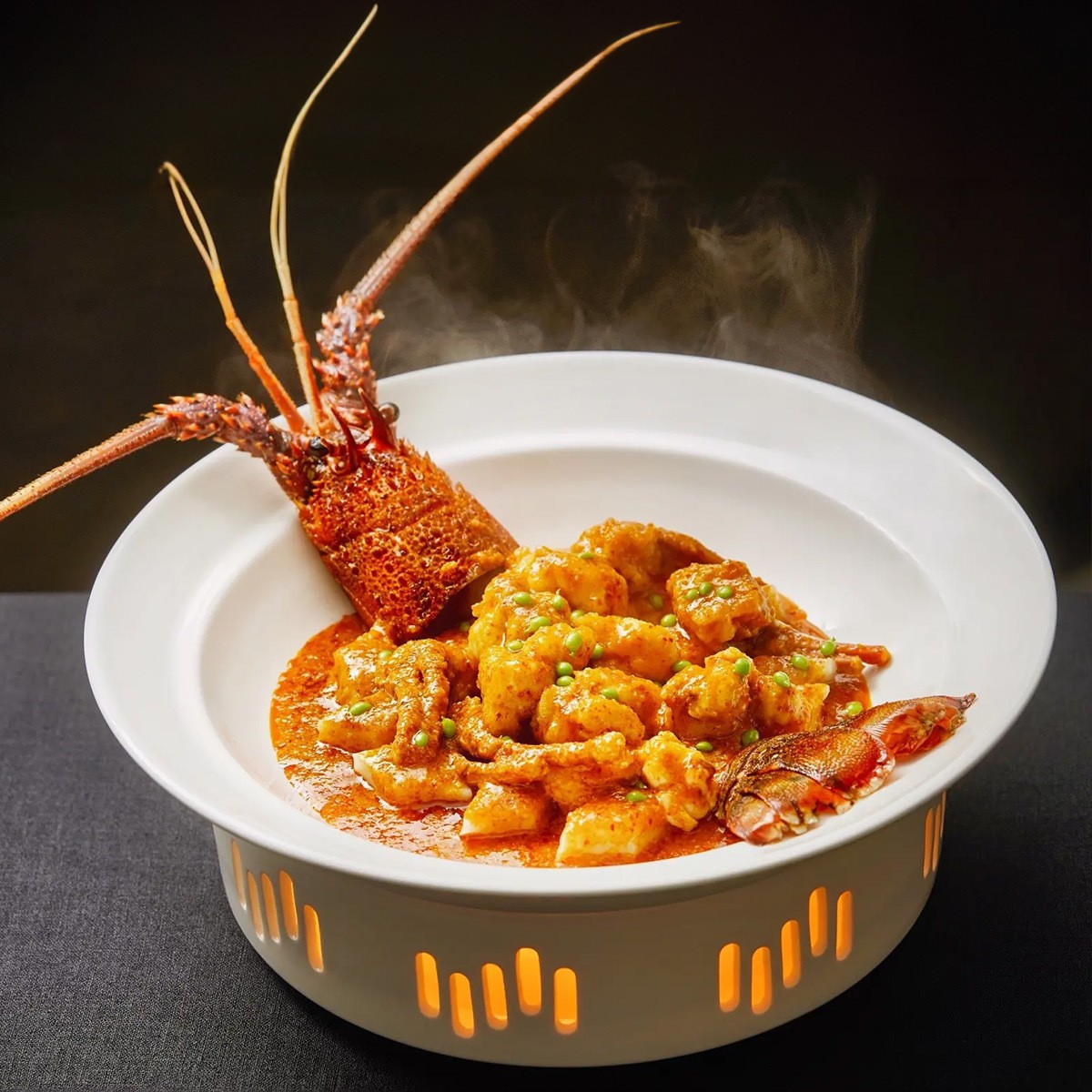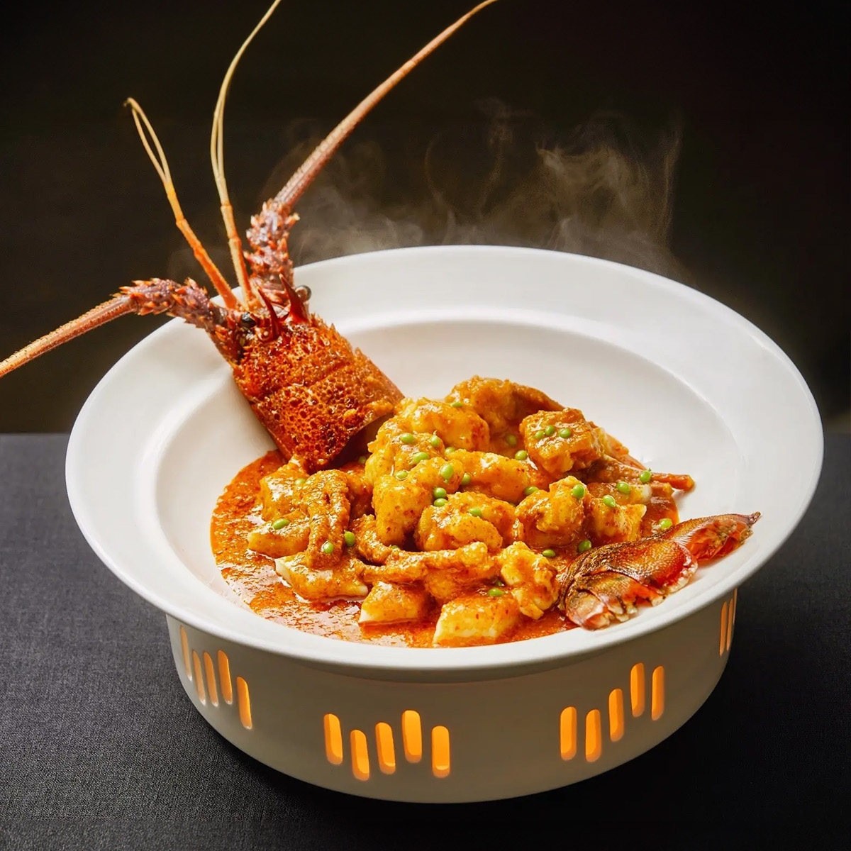 創意的なロブスターは蓋スープの皿を持っています。