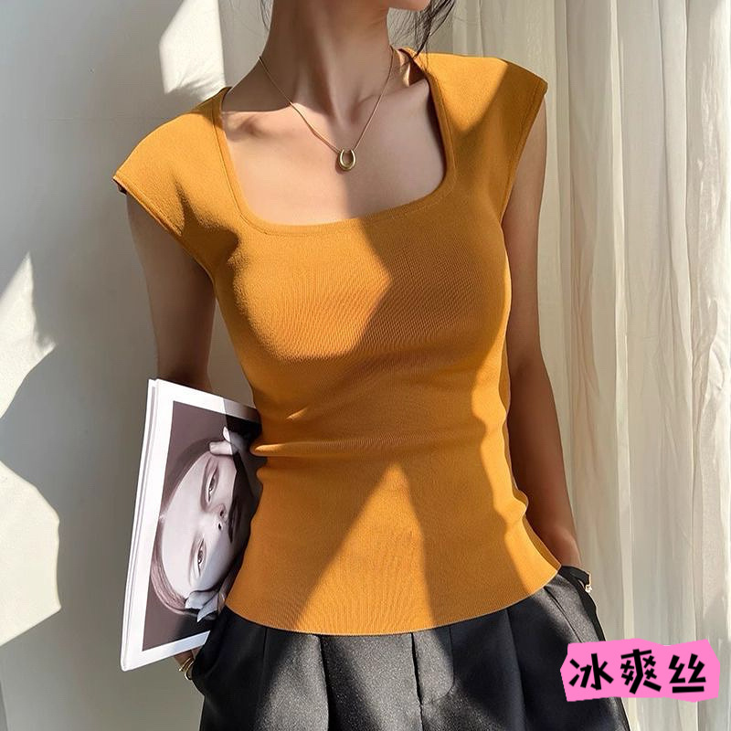 気質スリムノースリーブスクエアカラーバックストラップリボンレディースサマーデザインニッチプルオーバーセータートップ