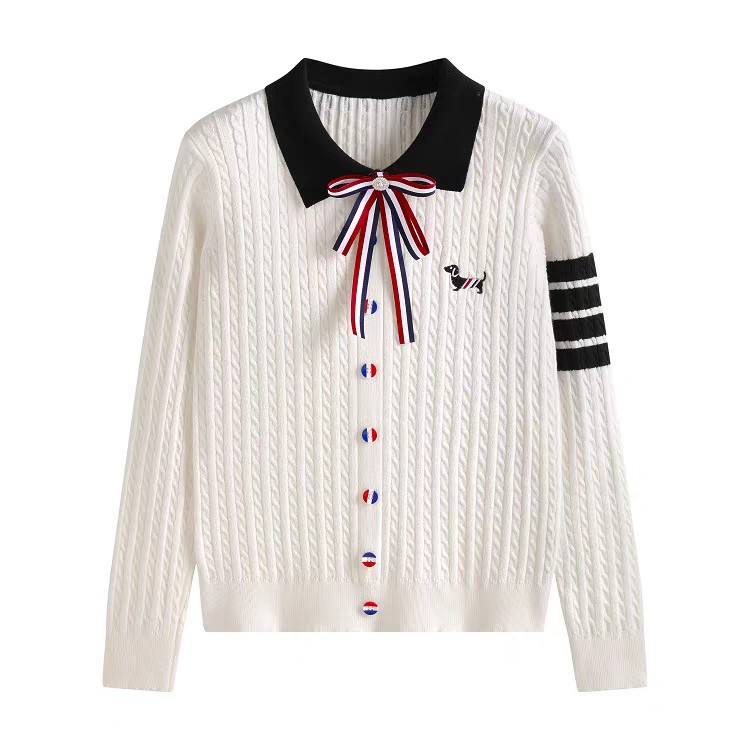 韩式小狗刺绣撞色翻领长袖针织上衣设计感可拆卸蝴蝶结学院风减