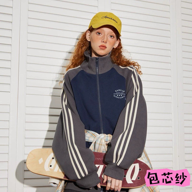 美式撞色半拉链立领女秋冬加绒宽松刺绣运动休闲长袖针织上衣